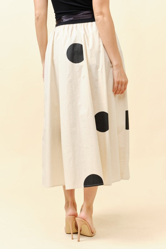 A tie-waist polka dot midi skirt featuring an elastic waistband for a comfortable fit and convenient side pockets. Comes with an additional satin tie that wraps elegantly around the waist for a polished, feminine finish. Crafted from a soft blend of 95% cotton and 5% spandex.