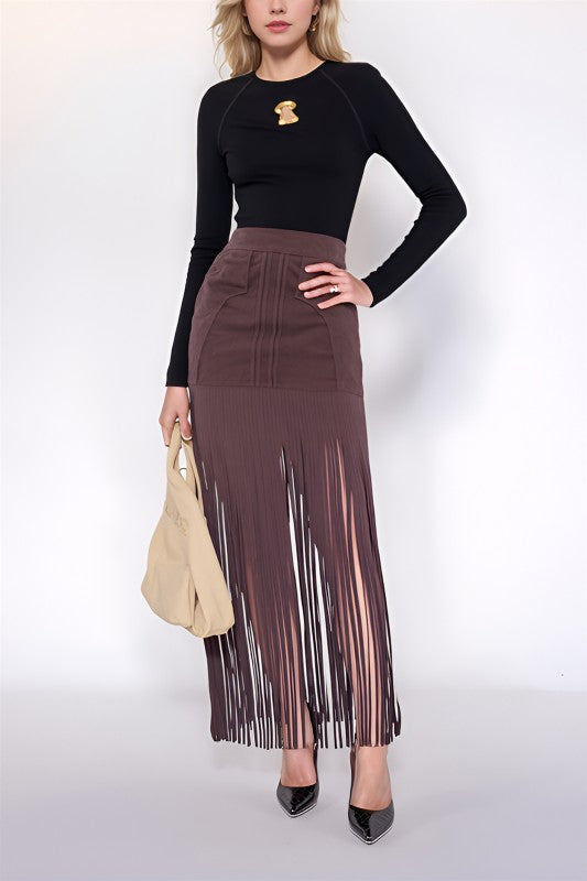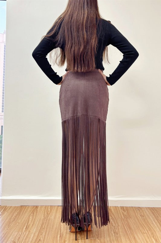 The Cacao Fringe Skirt is a soft faux suede maxi designed to move with attitude. Featuring a high-waisted silhouette, dramatic long fringe detailing, and a sleek back zipper, this skirt brings texture, motion, and a bold retro edge into one striking piece. Rich in tone and effortlessly statement-making, it’s made to stand out while still feeling wearable and chic.