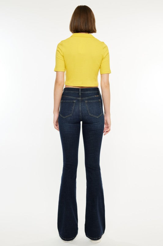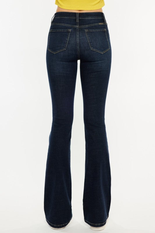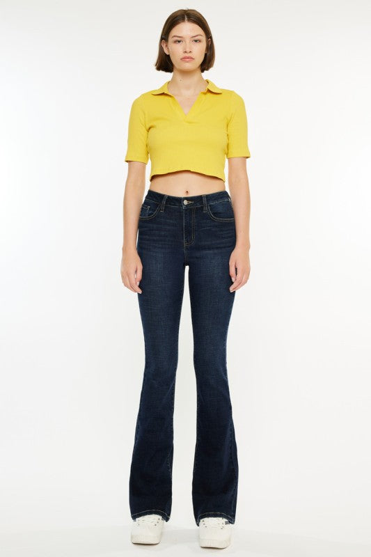 The Deep Indigo Flare is a high-rise bootcut jean designed in a dark wash for a sleek, elongating look. Featuring a classic five-pocket style and a zip-fly closure, this denim offers timeless versatility with a modern edge. Crafted with a comfortable stretch blend, it moves with you while maintaining its shape. Fabric content: 65.8% cotton, 29.8% polyester, 2.5% rayon, 1.9% spandex.