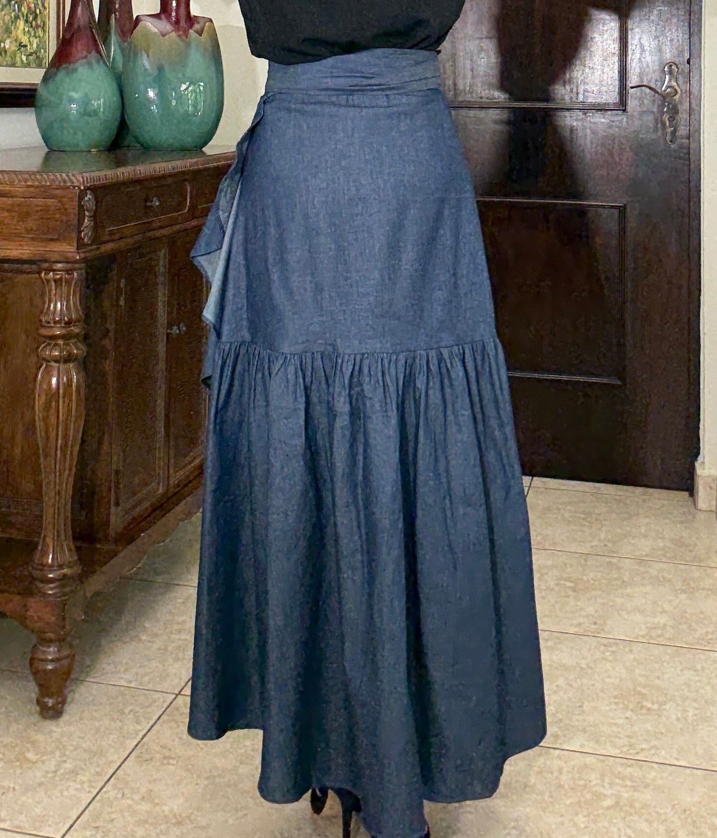 Crafted from soft polyester fabric, the Denim Spiral Skirt redefines versatile style. Designed as a true wrap skirt, its fluid spiral cut and tiered drape create effortless movement and a chic silhouette. The adjustable wrap construction allows it to be styled in multiple ways—wear it as a classic wrap skirt or transform it into a dress for a bold, fashion-forward look. A statement piece that blends creativity with timeless denim appeal.