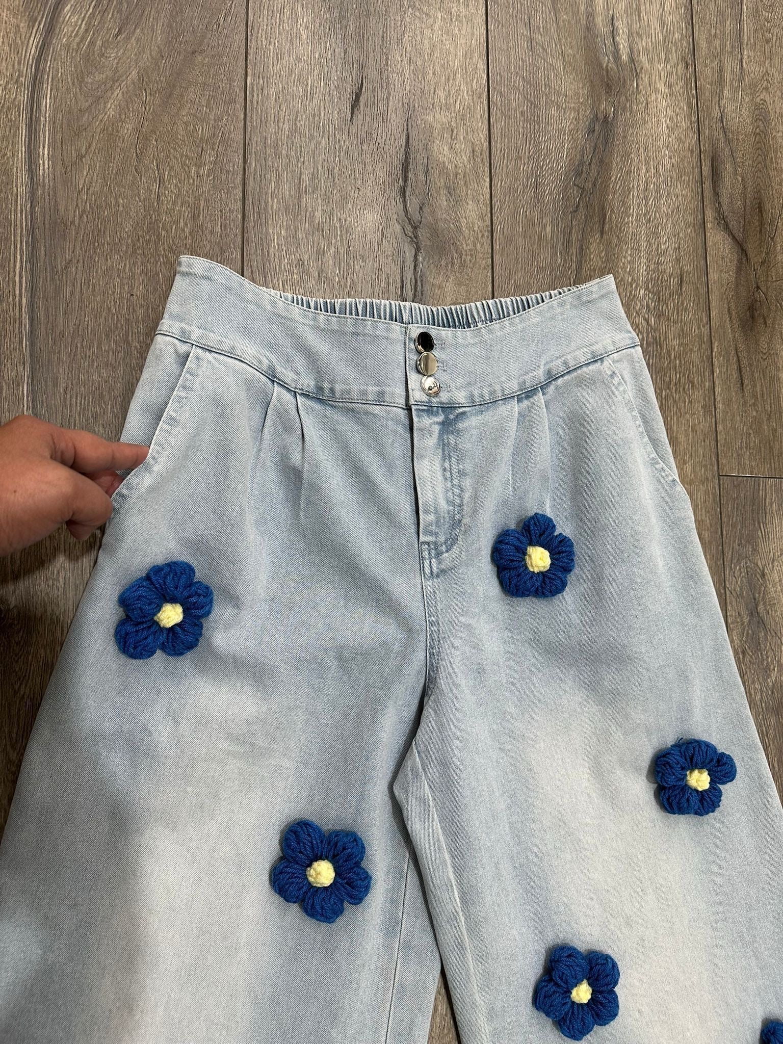 These beautiful wide-leg jeans are all about comfort with personality. They feature an elastic waistband at the back, a two-button front with zipper closure, and soft pleats that add a flattering touch. The fabric blend of 70% cotton, 28% polyester, and 2% spandex offers the perfect amount of stretch. Finished with functional front pockets and decorated with playful 3D knitted daisies in indigo blue, these jeans bring a fun and stylish twist to any look.