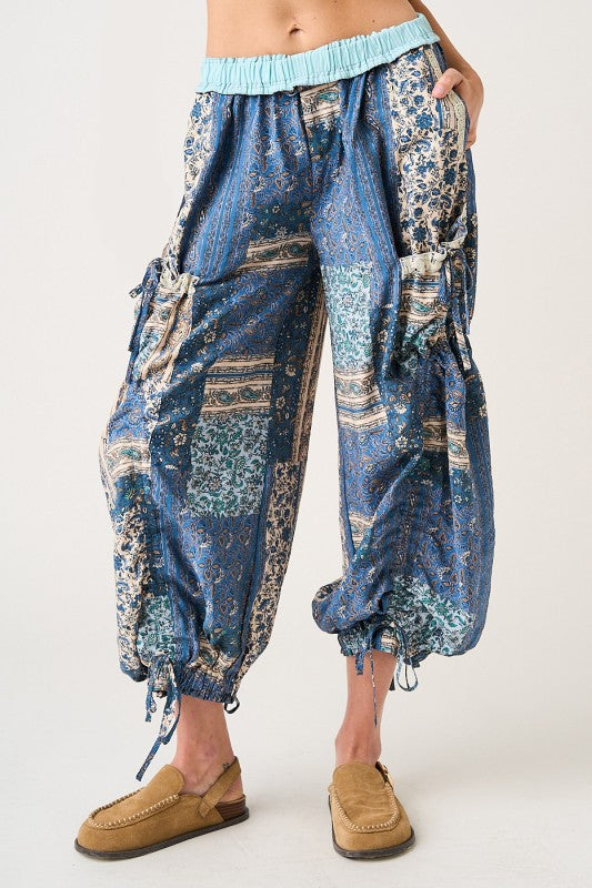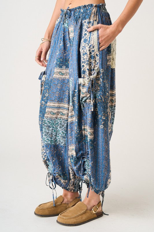 The Indigo Mosaic Balloon Pants are a statement boho piece crafted in a beautiful mix of patchwork and lace mixed media. Designed with a soft, foldable elastic waistband featuring contrast detail, these pants offer comfort without sacrificing style. The relaxed balloon-leg silhouette flows effortlessly, finished with adjustable ankle ties that let you customize the length and shape. Functional side pockets and drop pockets add an easy, lived-in feel, while the intricate lace patchwork creates texture, movement, and a one-of-a-kind look. Perfect for styling with simple tops or layered knits for an elevated, free-spirited vibe.