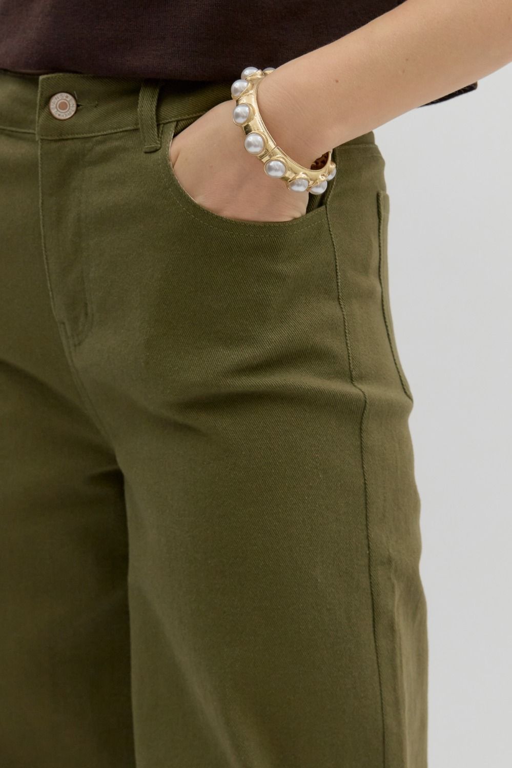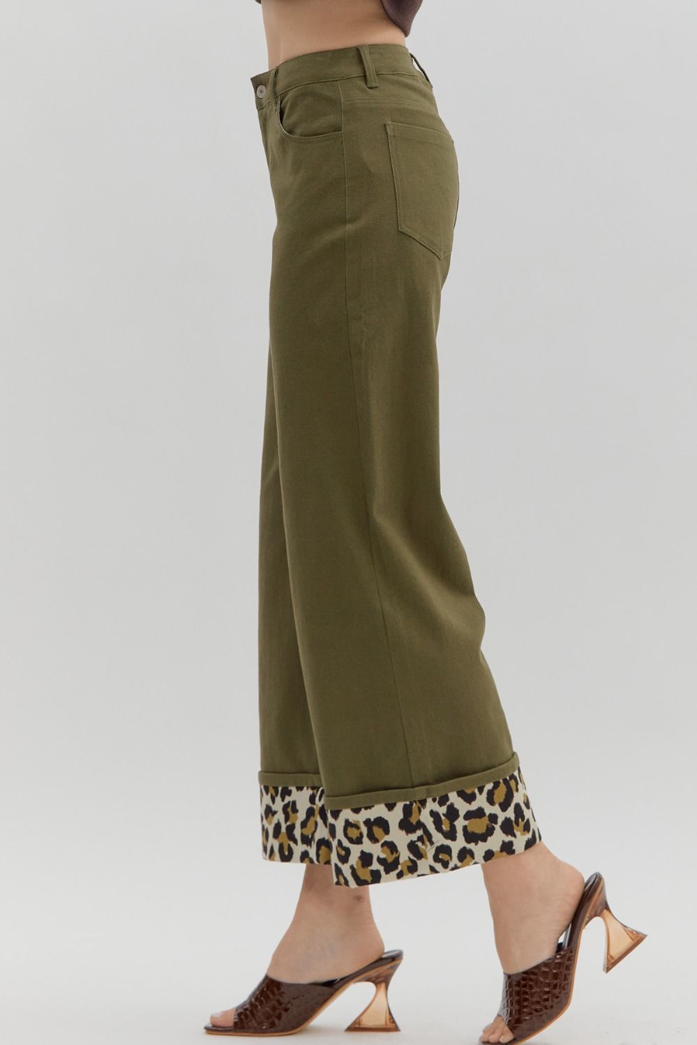 Jungle Cuff Pant is a high-waisted, wide-leg pant with a classic button fly and front zipper closure. This solid staple gets a bold twist with a striking contrast cuff hem featuring a wild leopard print. Crafted from a soft and stretchy blend of 97% cotton and 3% spandex, it’s the perfect mix of timeless structure and fierce detail.