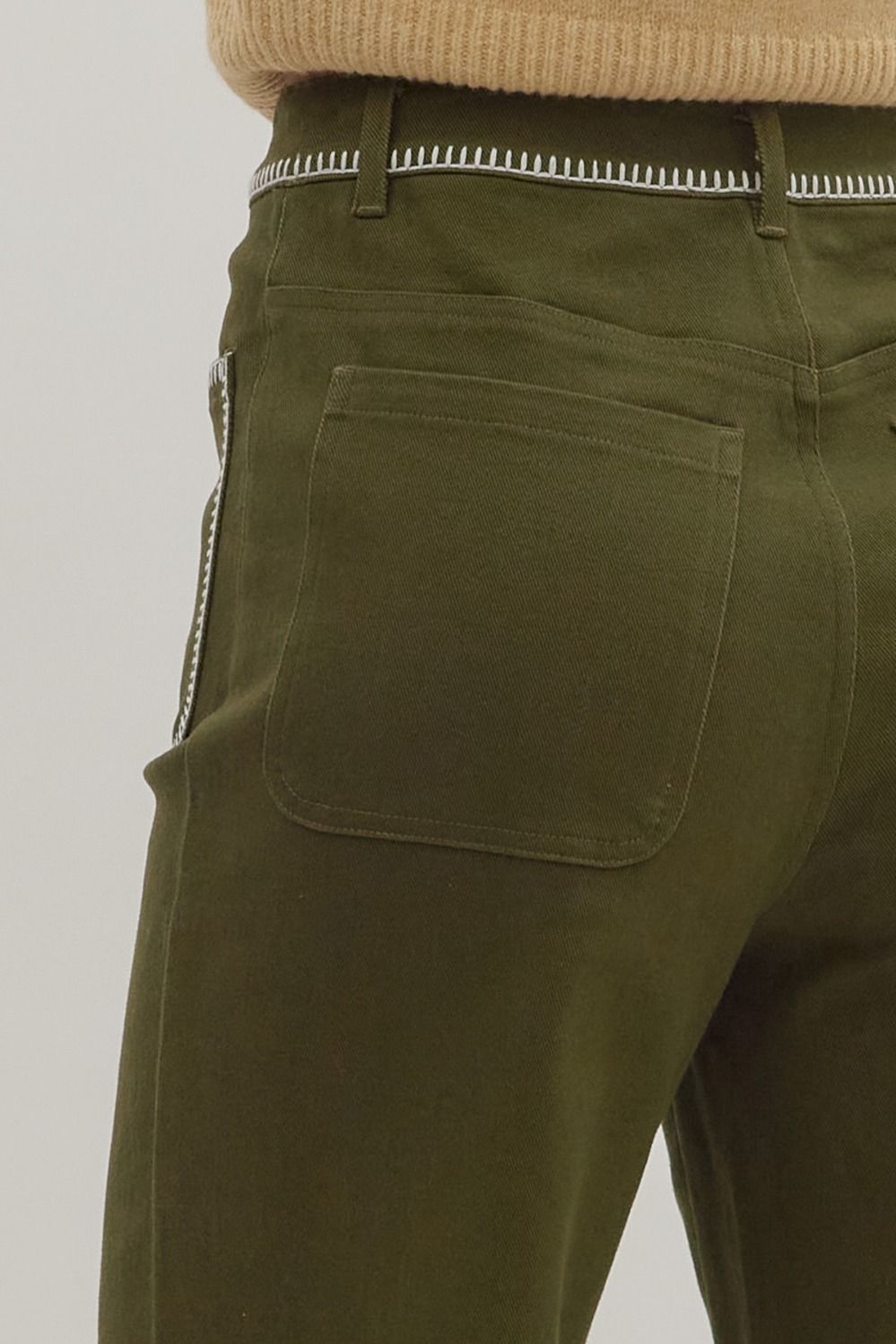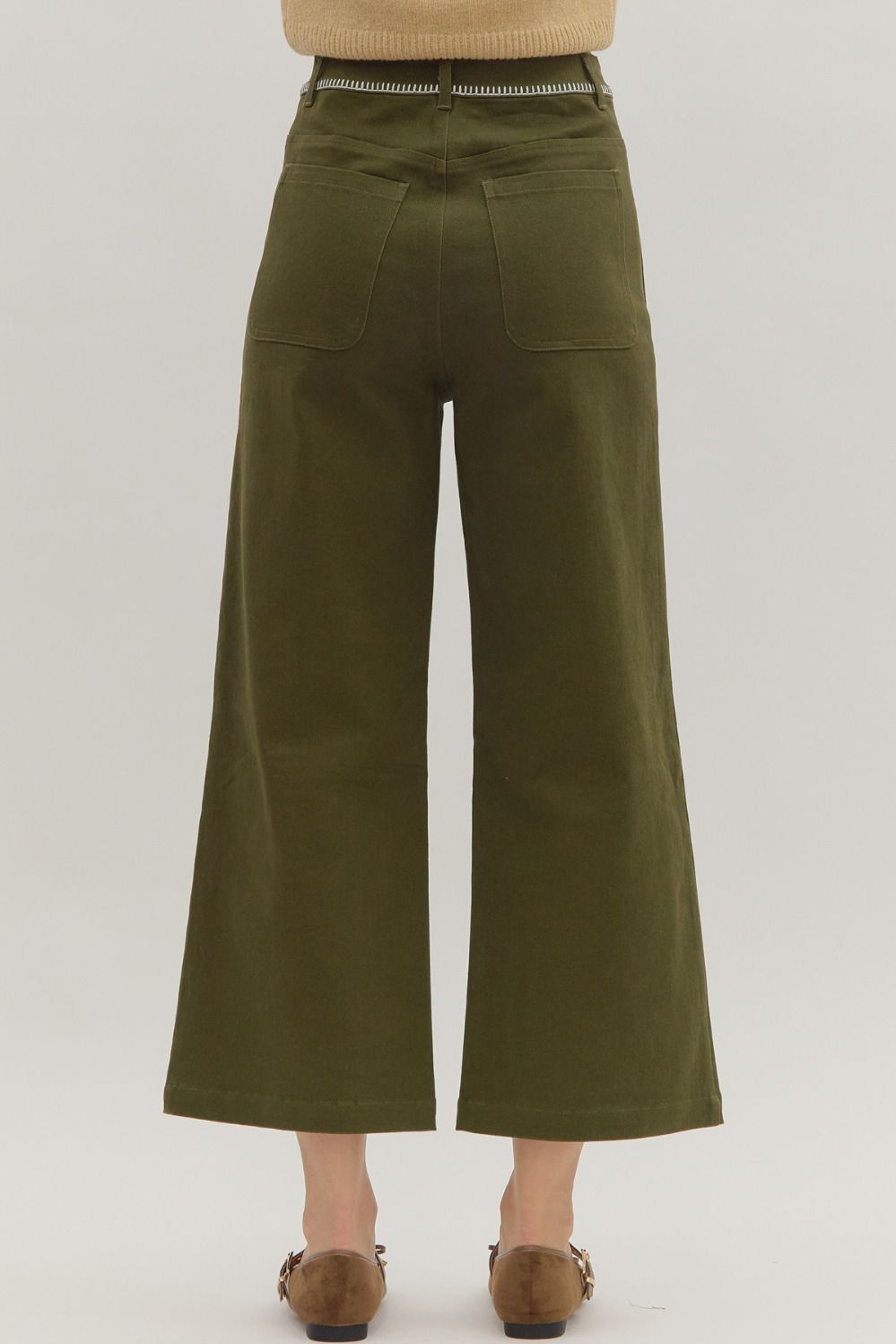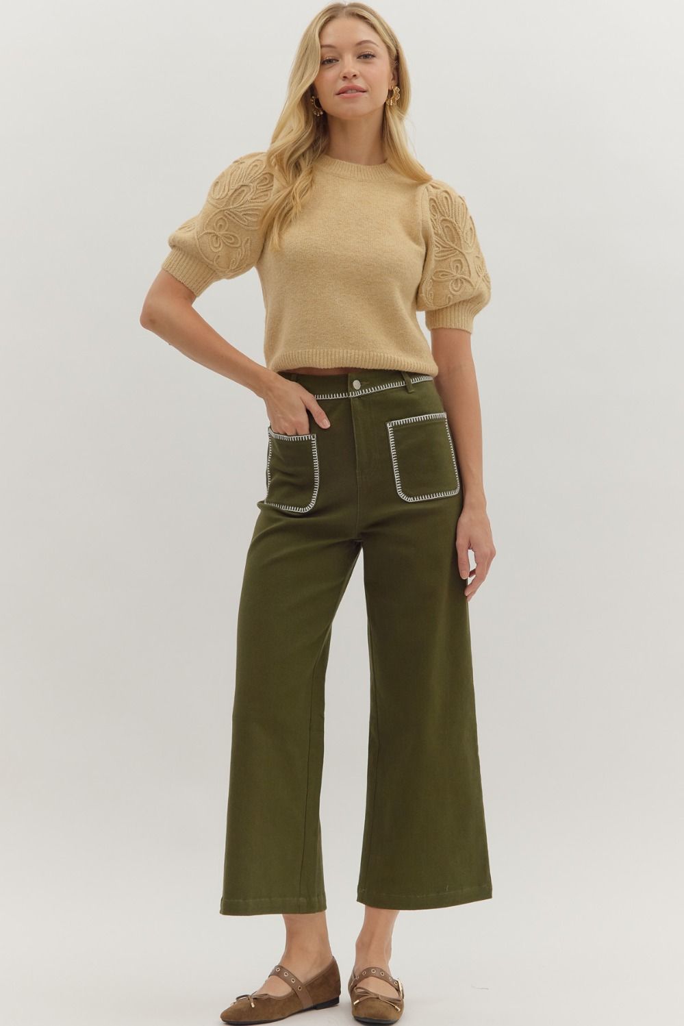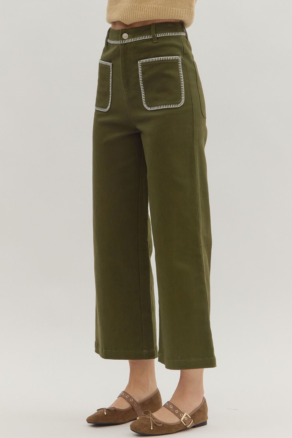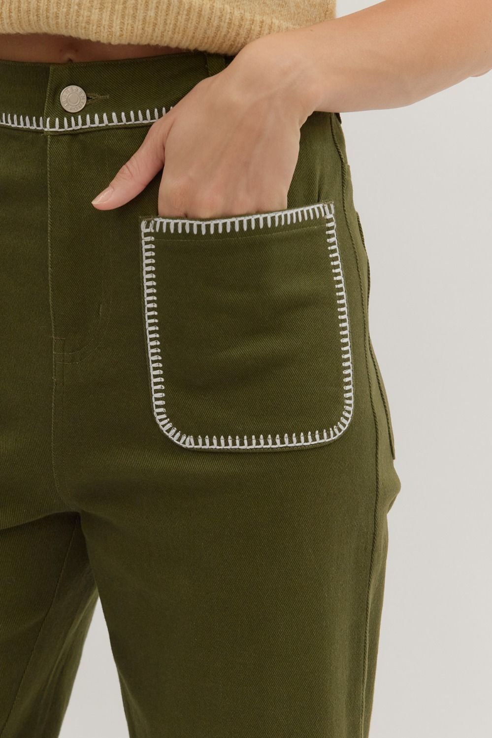 Crafted in a soft stretch blend of 97% cotton and 3% spandex, the Moss Stitch Pants deliver both comfort and style. These cropped capri pants feature two front patch pockets accented with bold contrast stitching, adding a statement touch. A distinctive stitched trim continues along the waistband, giving a polished yet fashion-forward edge. Perfect for everyday wear, these pants blend effortless versatility with cool detailing.