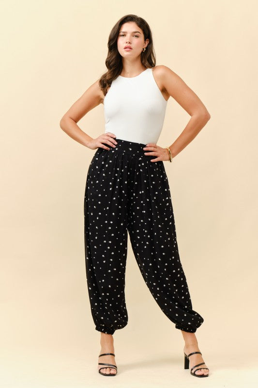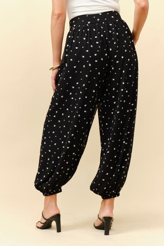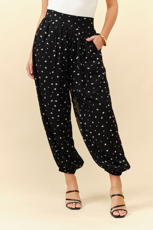 Polka Flow Pants are chic and effortlessly breezy, crafted in a lightweight chiffon fabric with a playful polka dot design. These high-waist harem pants feature a relaxed silhouette with gathered ankles for a flattering drape and elegant movement. Designed with side pockets and a side zipper closure, without any elastic at the waist, they offer a refined yet comfortable fit. Fabric content: 100% polyester.