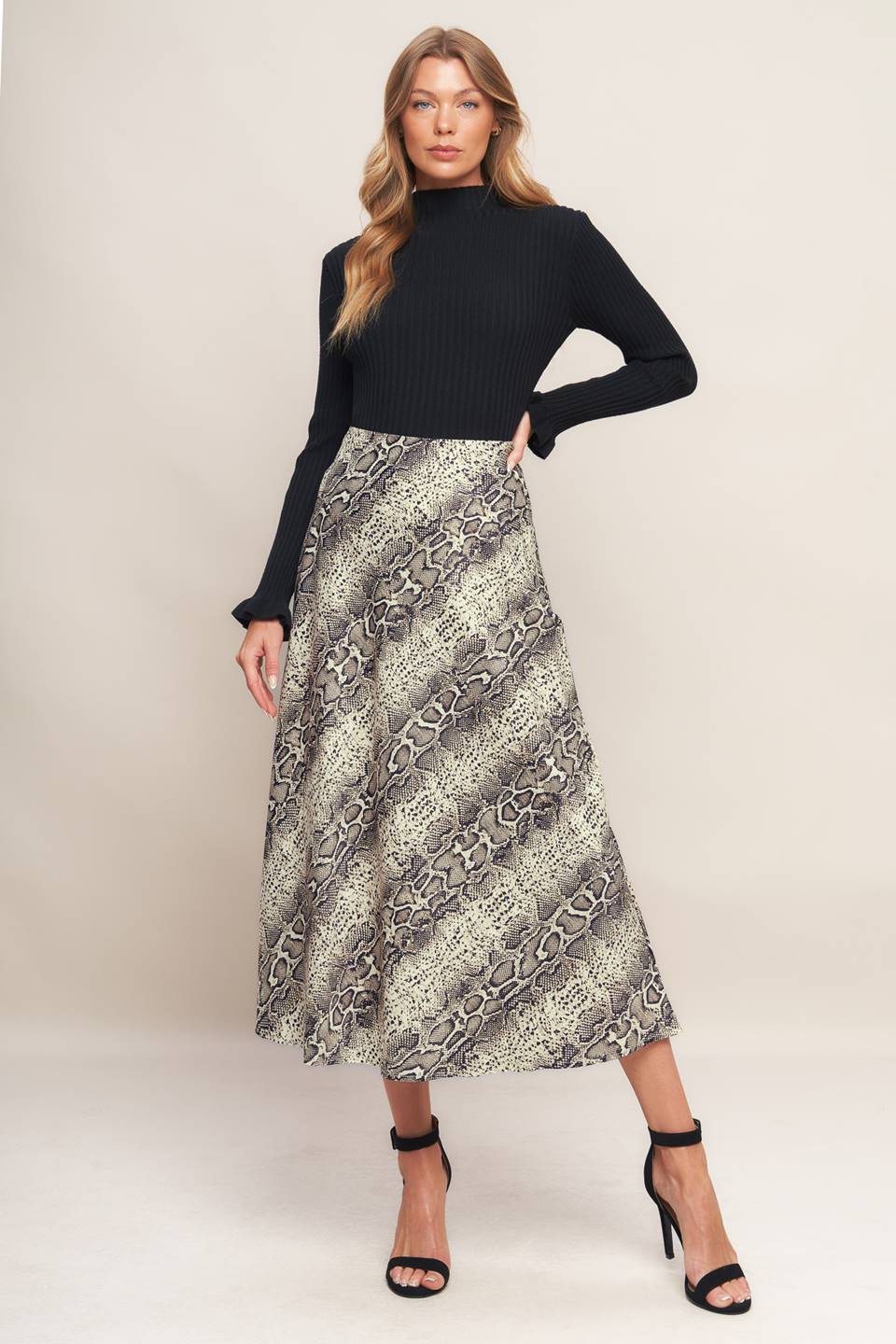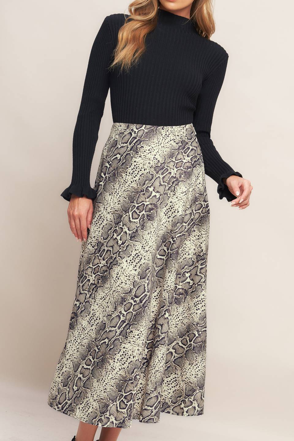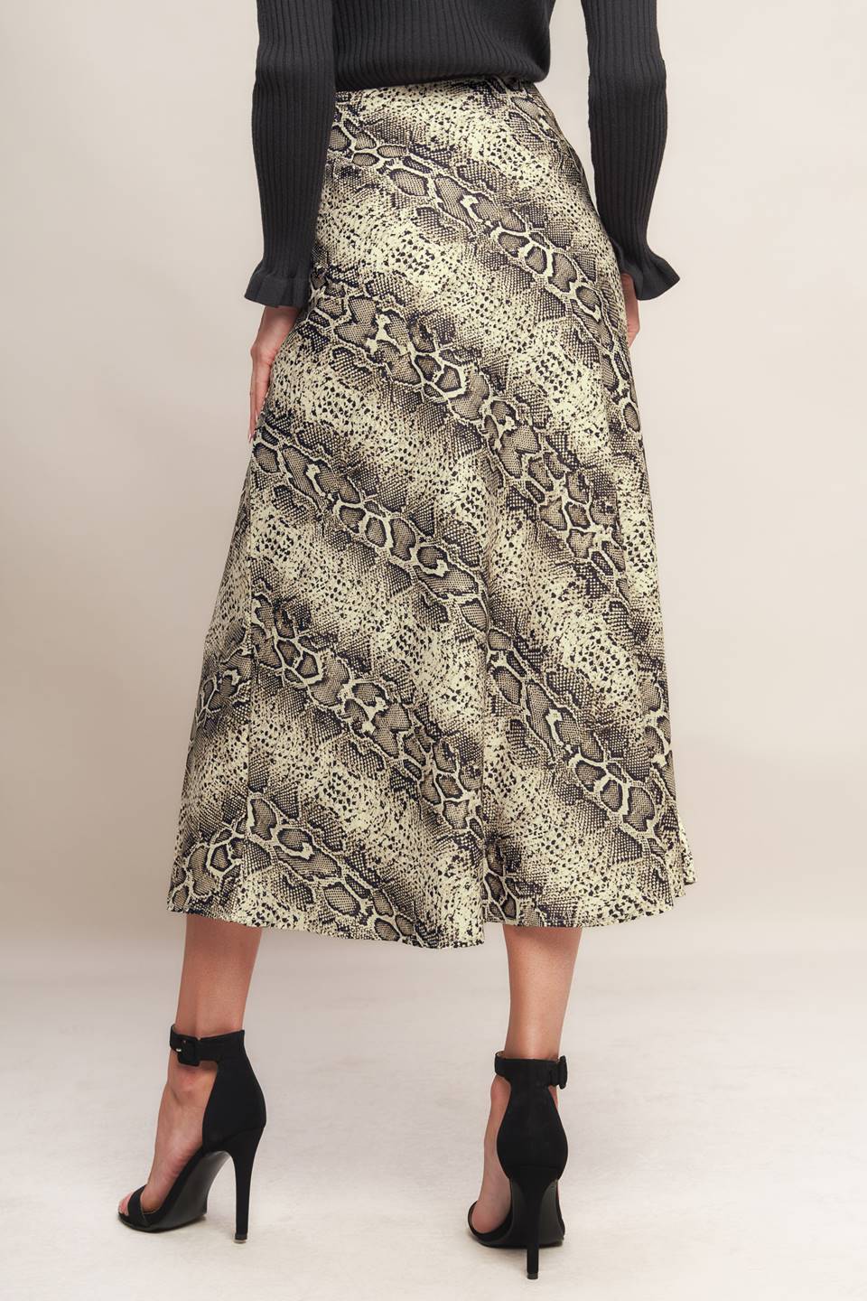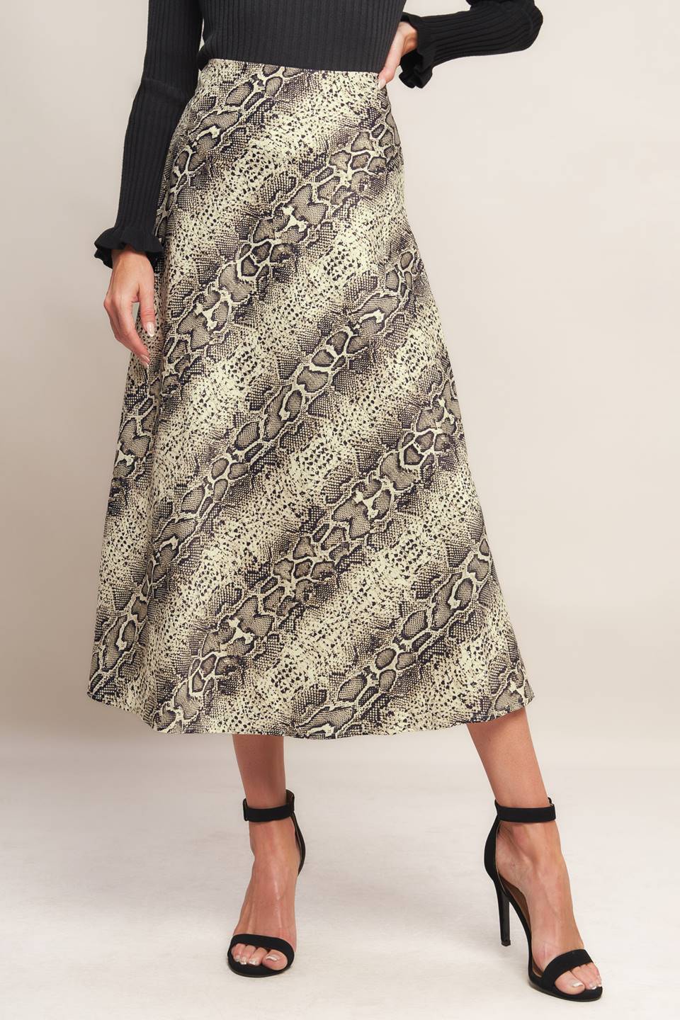 The Python Whisper Skirt is a printed bias-cut skirt designed to drape effortlessly with a fluid silhouette. It features a sleek side zipper closure for a polished finish. Fabric content: 100% polyester.