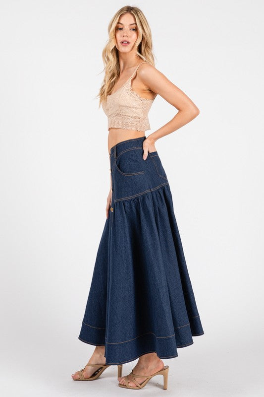 Soho Indigo Skirt is a woven solid denim A-line maxi skirt designed to blend structure with effortless movement. Featuring front button details, functional side and back pockets, and a flattering high-waist silhouette, this piece brings urban sophistication to classic denim. Made from a comfortable blend of 78% cotton, 20% polyester, and 2% spandex, it offers just the right amount of stretch for all-day wear.
