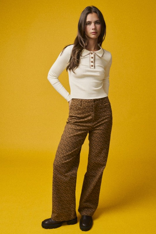 Effortlessly cool and unique, the TerraFlow Pants are a modern twist on everyday denim. Designed in a high-rise silhouette with a flattering wide-leg cut, these jeans feature an all-over speckled print that brings texture and edge to your look. Complete with a classic zip-fly and button closure, plus functional front and back pockets, they combine style with practicality. Crafted from a comfortable blend of 97% cotton and 3% spandex, they offer a relaxed fit with just the right touch of structure — perfect for adding statement flair to casual or elevated outfits.