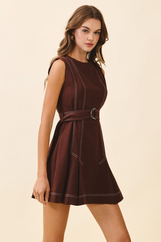 Contour Belt Dress – A sleeveless mini dress featuring contrast topstitching, a front pleat, and a matching belt waist. Its polished tailored silhouette brings a modern edge, while the hidden back zipper ensures a seamless finish. Fabric content: 100% cotton.