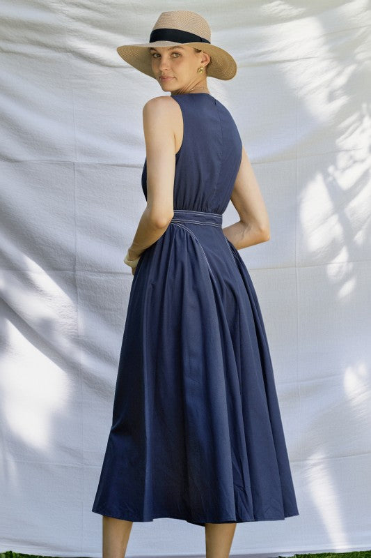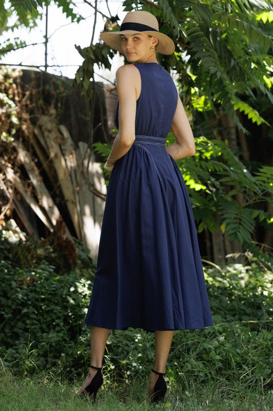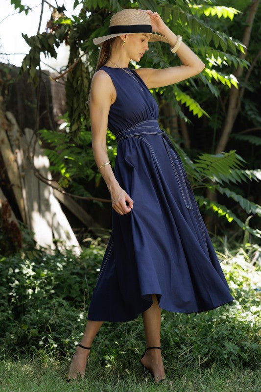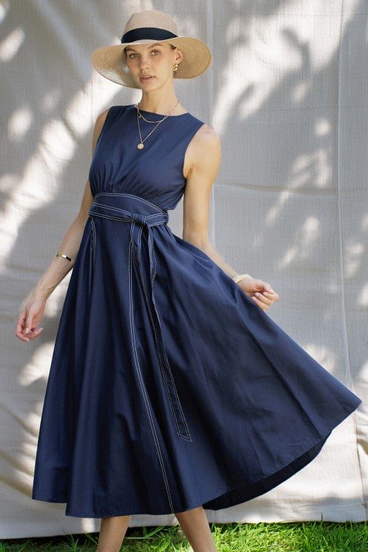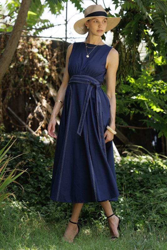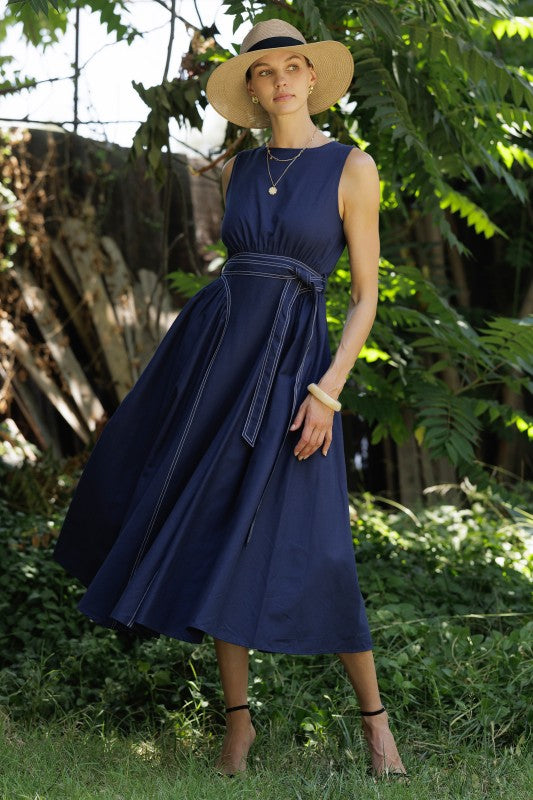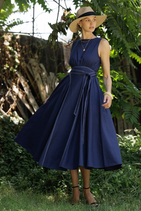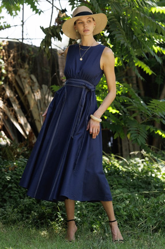 A classic sleeveless navy dress designed for both elegance and comfort, featuring a flattering cinched waist with a matching tie belt and a full A-line skirt. It includes an invisible back zipper for a seamless finish.