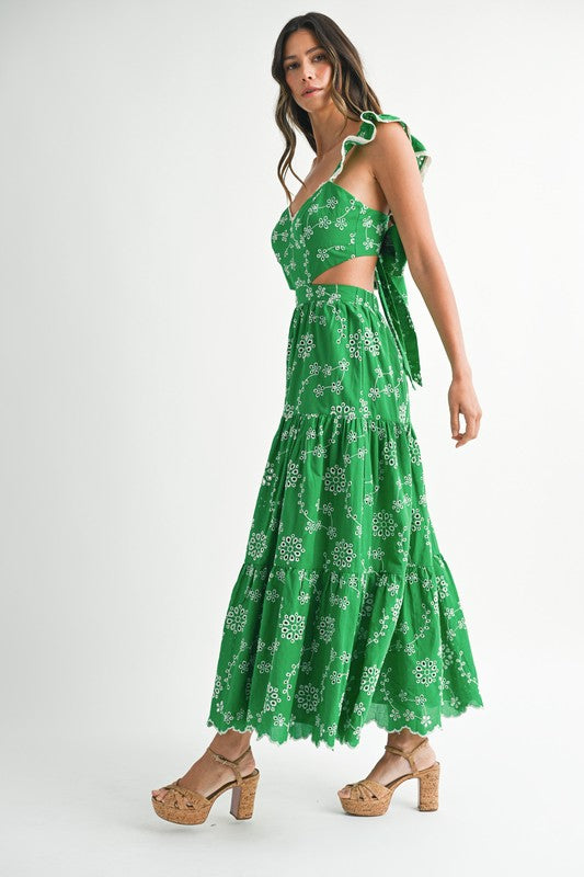 Designed with delicate eyelet embroidery and romantic lace-trim flutter sleeves, this midi features a sweetheart neckline with playful side and back cutouts for just the right touch of sass. The tiered skirt adds effortless movement, while the back self-tie and elastic waistband keep the fit comfy and flattering. Fully lined so you can float through your day (or night) with confidence and style.