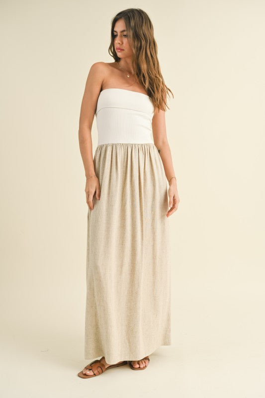 Meet your new resort obsession. The Oasis Blend Dress is the perfect mix of effortless and elevated, featuring a ribbed knit strapless top paired with a breezy linen-blend skirt for that easy, sun-kissed vibe. It’s the kind of dress you throw on once and instantly look put together—no styling stress required.