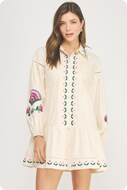Cool, effortless, and full of charm, the Petal Folk Dress is a beautiful mini blouse dress with a relaxed, boho spirit. Crafted in breathable cotton, this embroidered pink shirt-style mini features a button-front design and playful folk-inspired detailing that makes it feel special but still easy to wear. Side pockets add that everyday-cool factor, because yes—it has pockets.