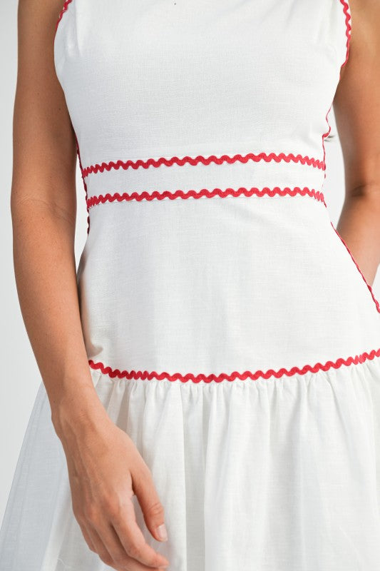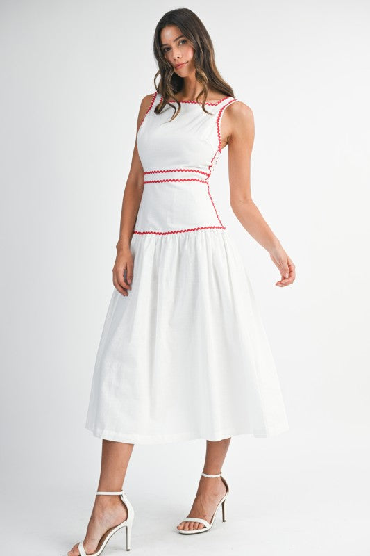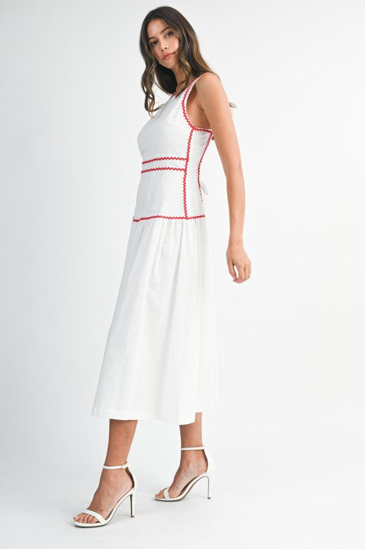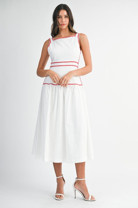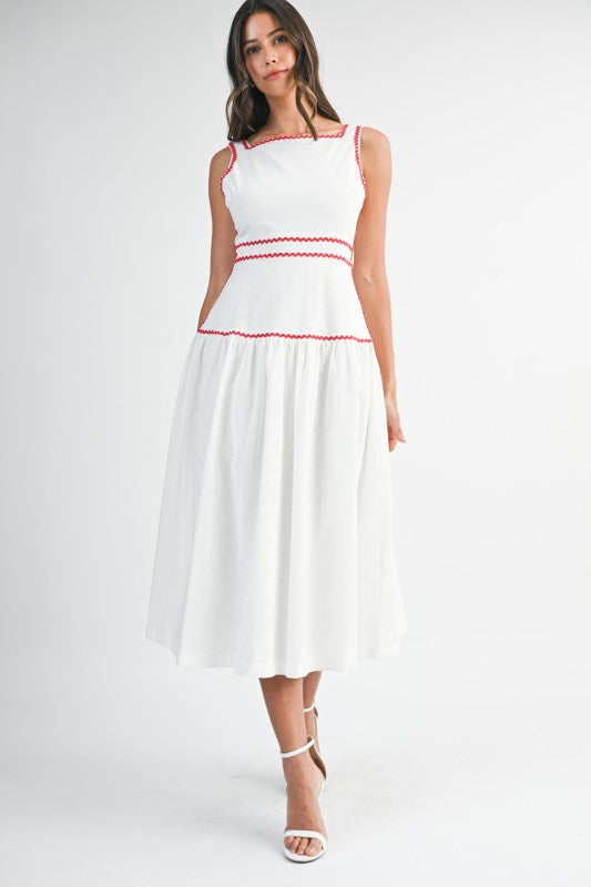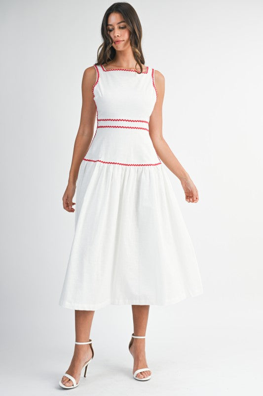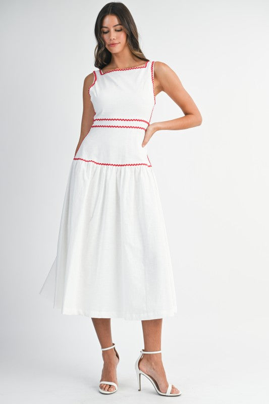 Scarlet Trim Midi is a timeless sleeveless midi dress designed with a clean square neckline and delicate rickrack trim that adds a subtle pop of contrast. Crafted in a breathable linen-blend fabric, it features a flattering structured bodice and a softly flowing skirt for effortless elegance. The back self-tie detail allows for an adjustable, feminine fit, while an invisible back zipper keeps the silhouette polished and seamless. Perfect for daytime events, brunch dates, or warm-weather gatherings, this piece blends classic charm with modern ease.