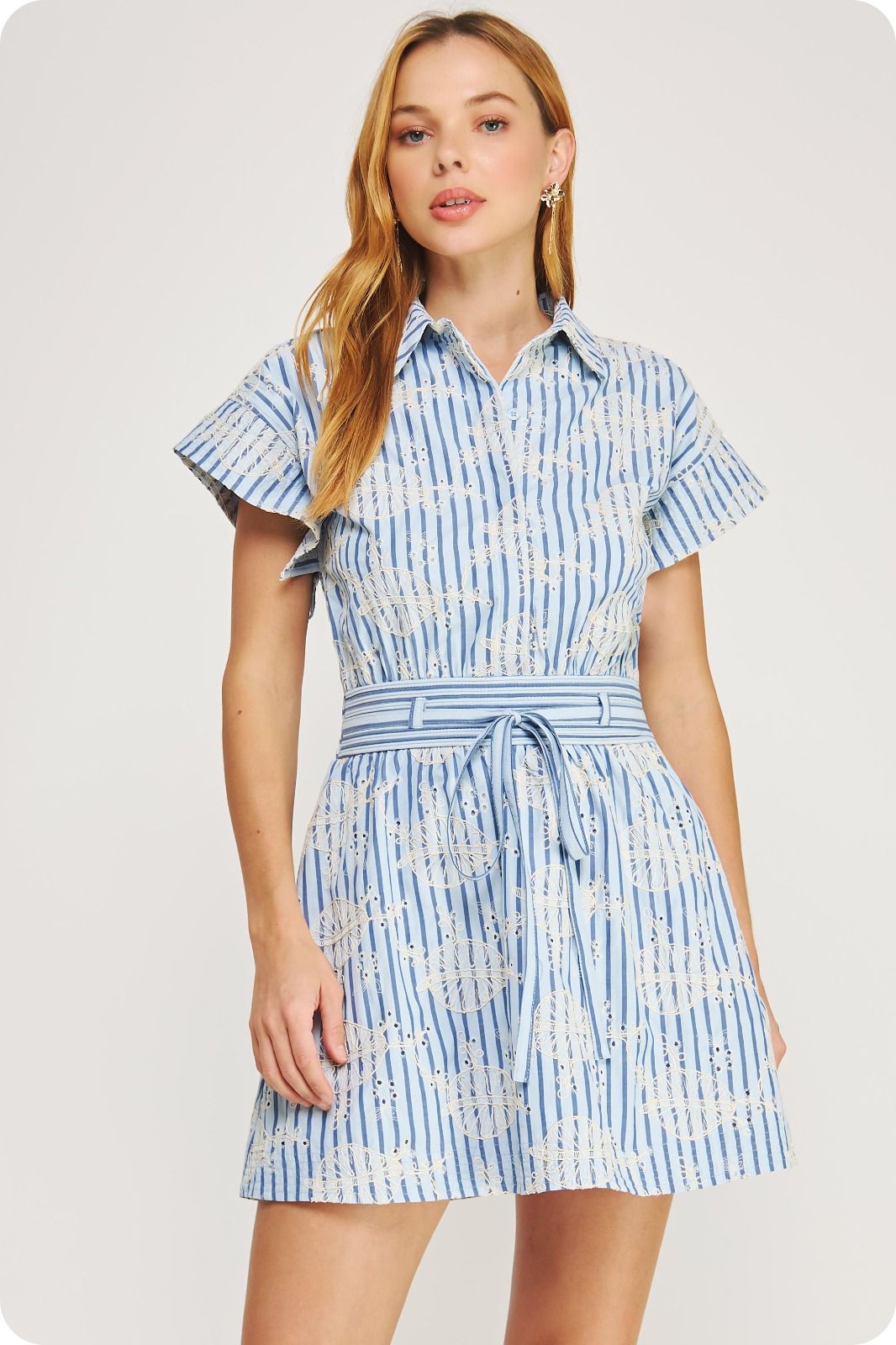 Light, flirty, and full of charm, the Sea Breeze Lace Mini brings effortless coastal vibes with a touch of sass. Crafted in a beautifully textured blue stripe fabric with delicate lace detailing, this mini dress features a button-front design that adds classic polish with a playful twist. The waist is finished with smocked elastic at the back for a flattering, comfortable fit, plus a removable waist tie so you can cinch it in or wear it loose depending on your mood.