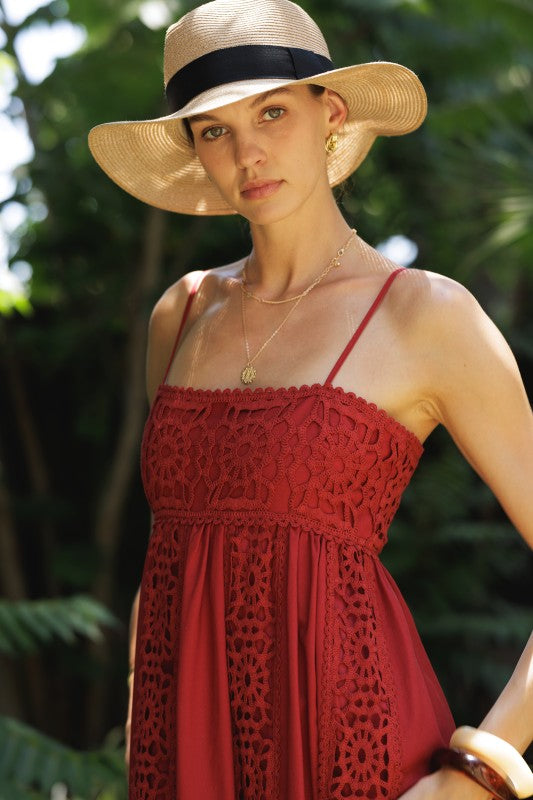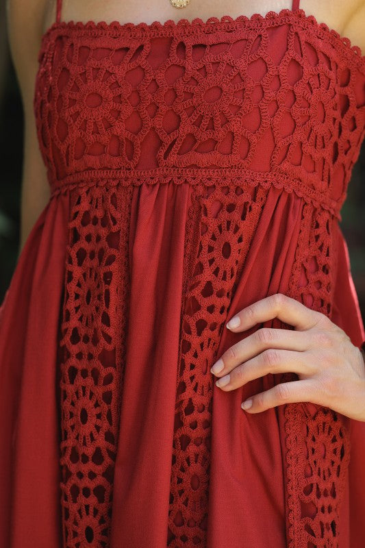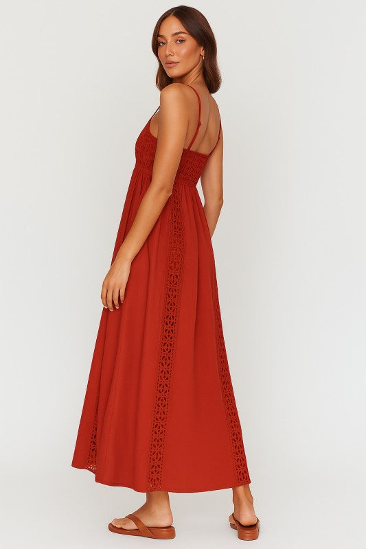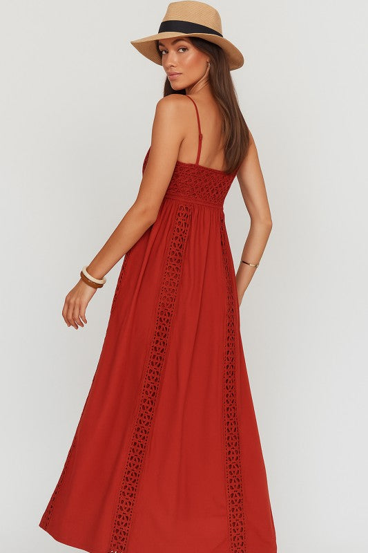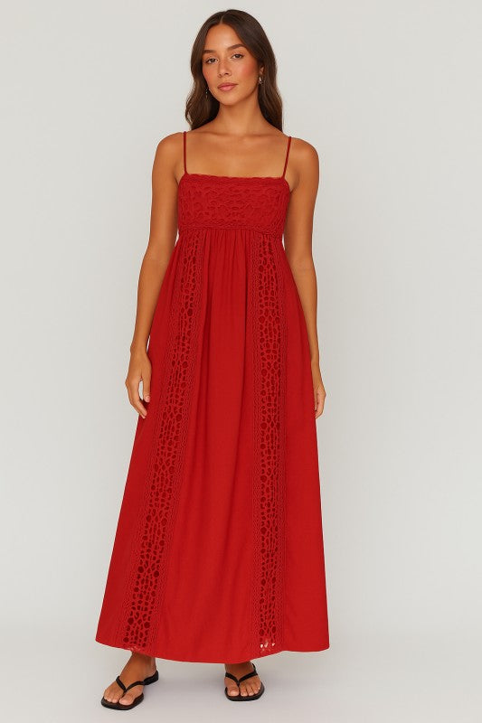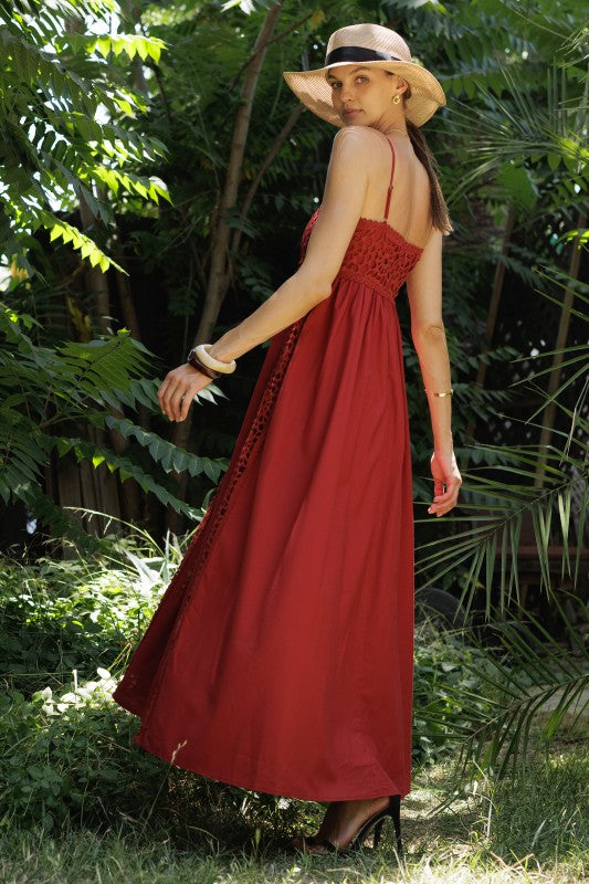 A crochet-accent maxi dress with a natural, effortless charm. Crochet detail stripes run gracefully along the length of the dress, creating a beautifully textured and romantic silhouette. The bust features delicate crochet lace trim, adding a soft, feminine touch to the design. Adjustable straps ensure a comfortable and customizable fit, while a discreet zipper offers easy wear without disrupting the elegant flow.
