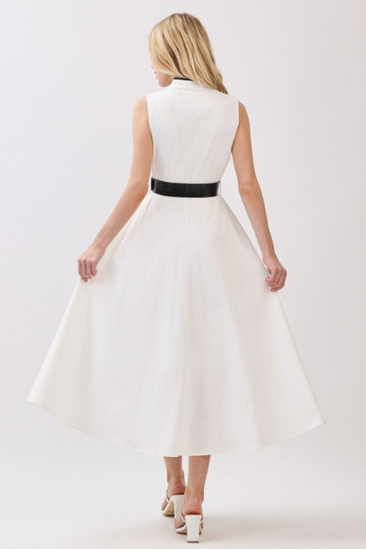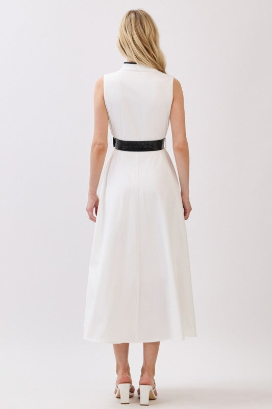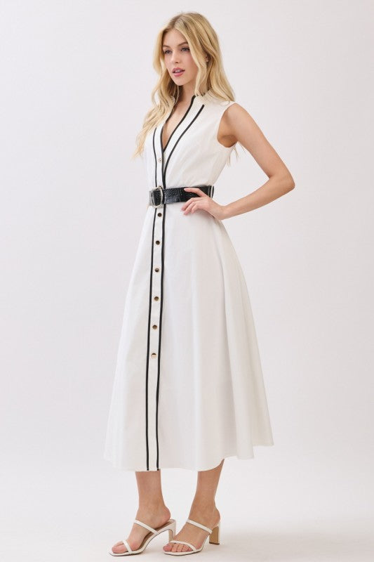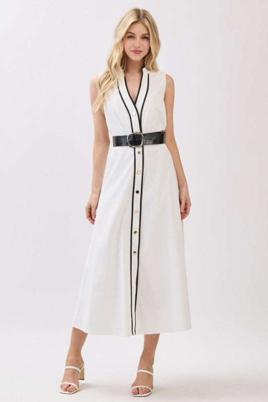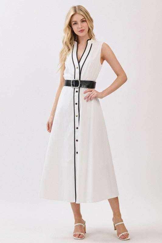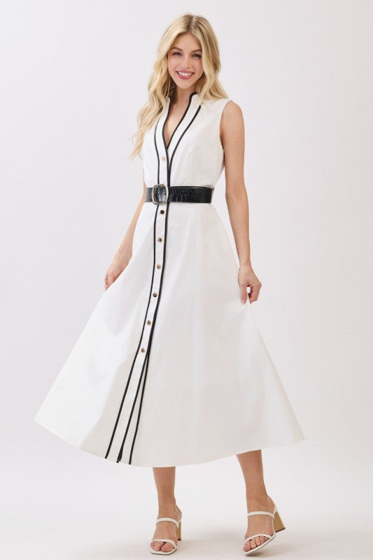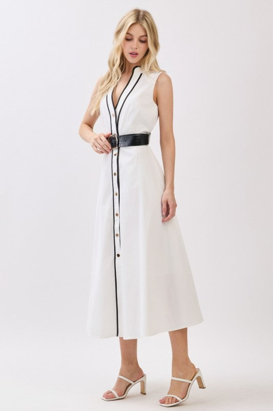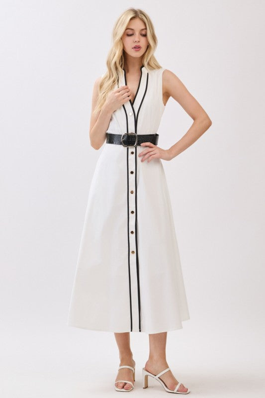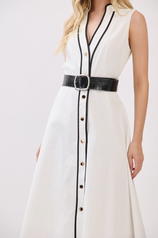 The WideFrame Midi is a sleeveless button-down dress in crisp white, accented with sharp contrast trim for a striking finish. Designed with a belted waist to flatter the silhouette, this chic midi balances timeless elegance with modern structure. Crafted from a breathable blend of 60% cotton and 40% polyester.