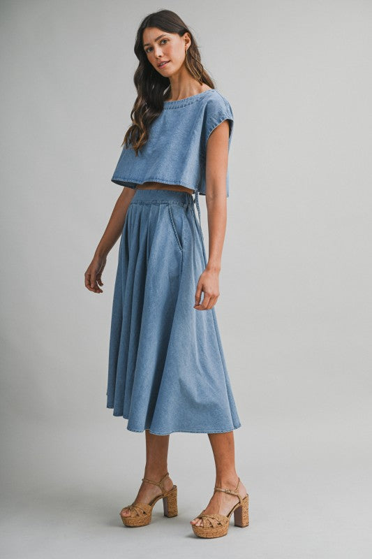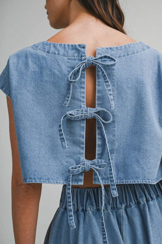 The Denim Tie-Back Set brings playful attitude with a cool, effortless edge. Featuring a cropped short-sleeve denim top with a triple self-tie closure at the back, this set is all about the details. The matching high-waist pleated midi skirt is finished with side pockets and an elastic back waistband for an easy, comfortable fit. Wear it together for a standout look or mix and match for endless denim moments.