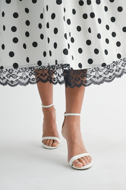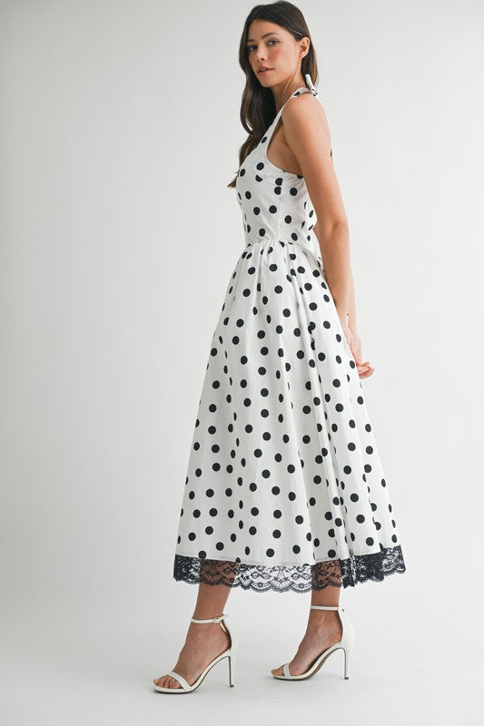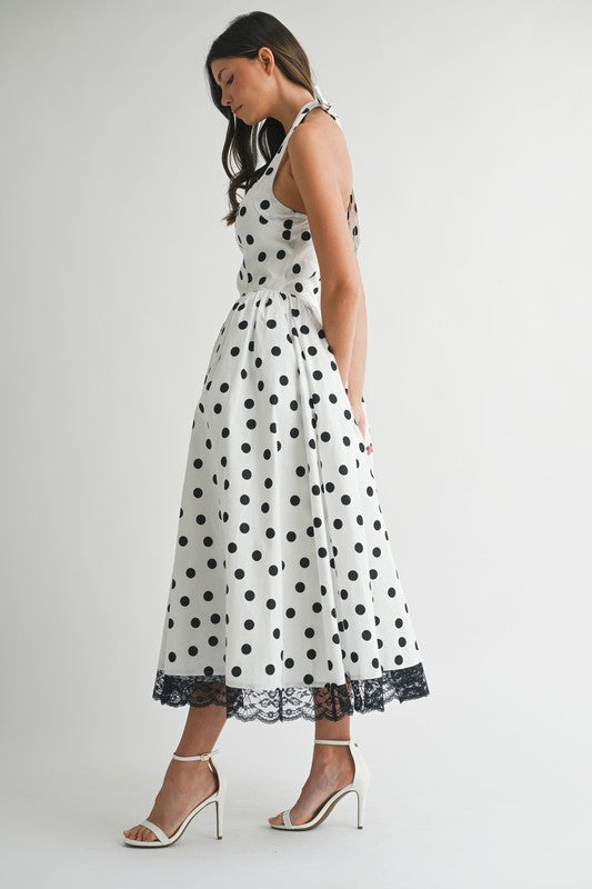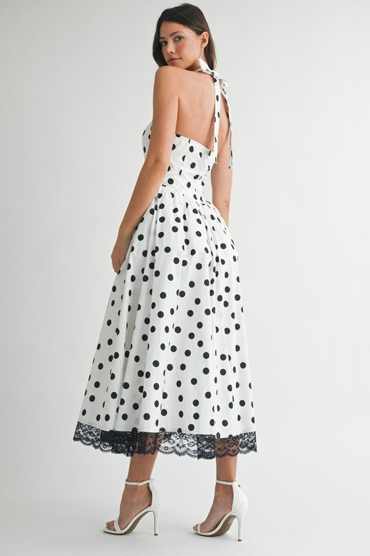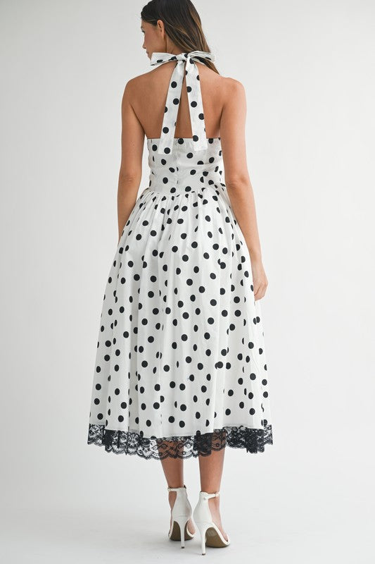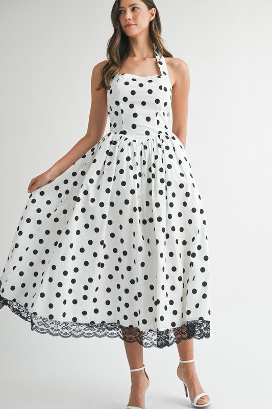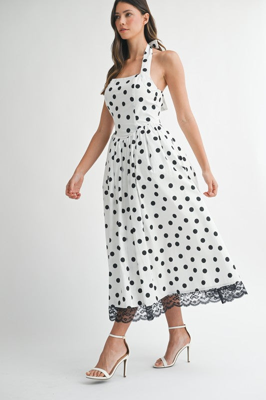 A timeless polka-dot midi dress featuring a chic halter neckline and a flattering open back. Designed with a gathered skirt for graceful movement, it’s finished with a delicate lace trim hem for a touch of elegance. The back self-tie and invisible zipper ensure a perfect fit.