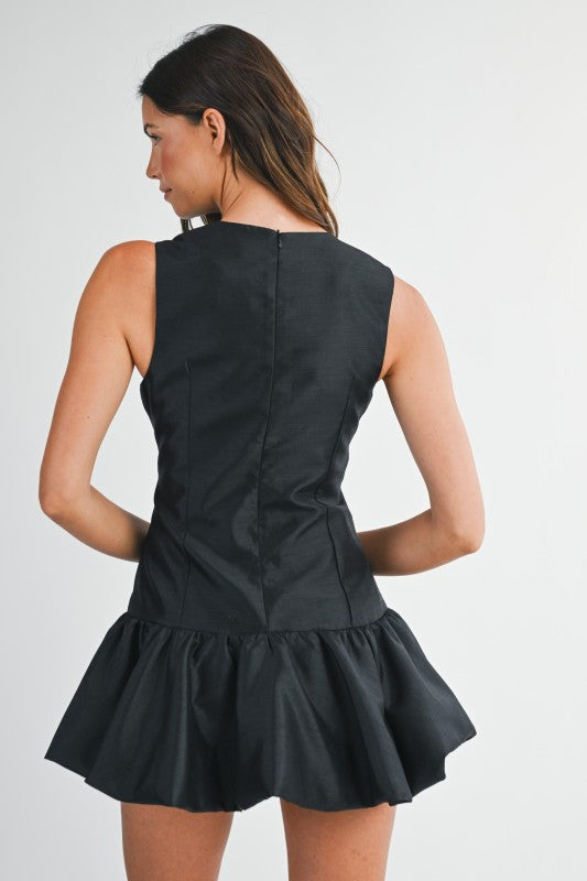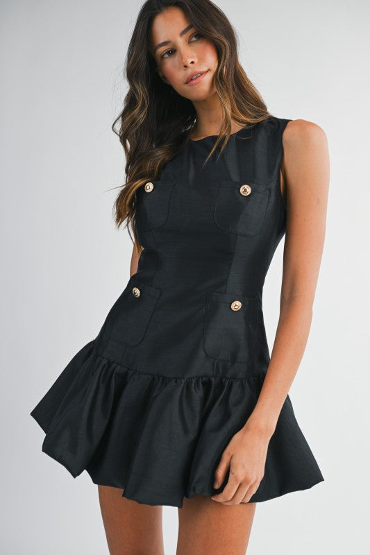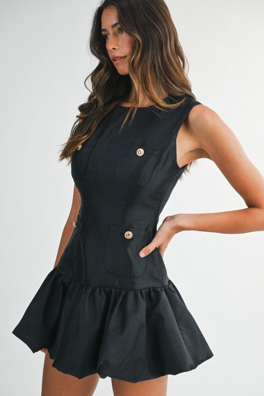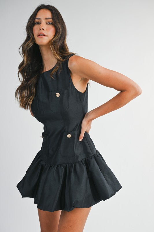 The Gold Button Flare is a sleek sleeveless bubble hem mini dress designed for modern elegance with a playful twist. This solid mini dress features front patch pockets adorned with chic gold button details, adding a touch of sophistication. The bubble hem creates a flirty silhouette, while the back invisible zipper ensures a seamless fit.