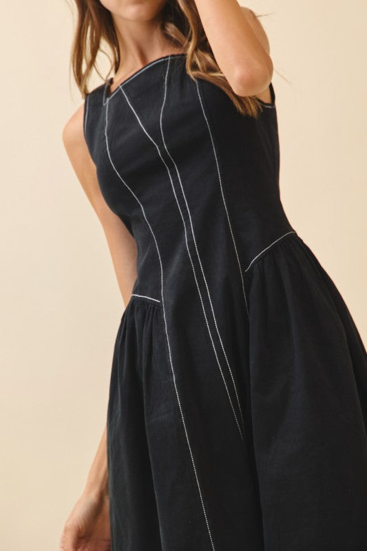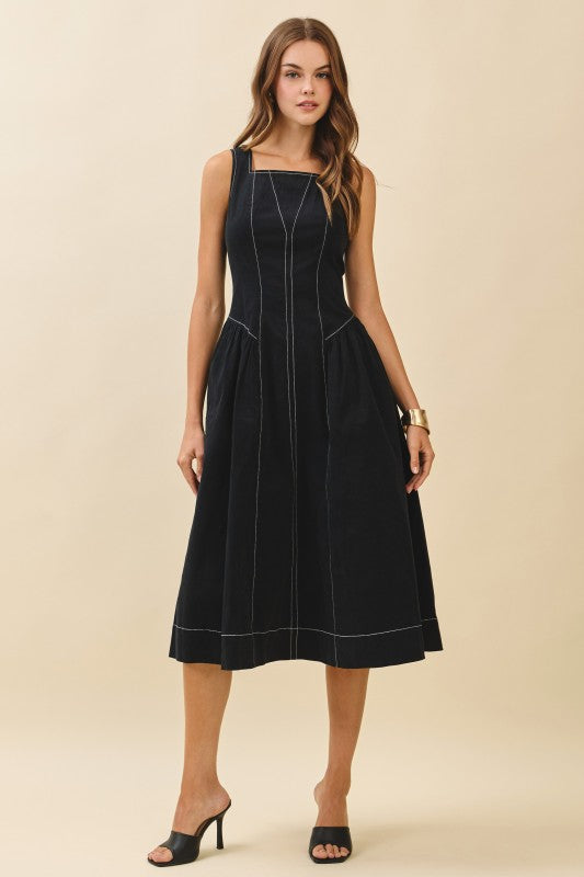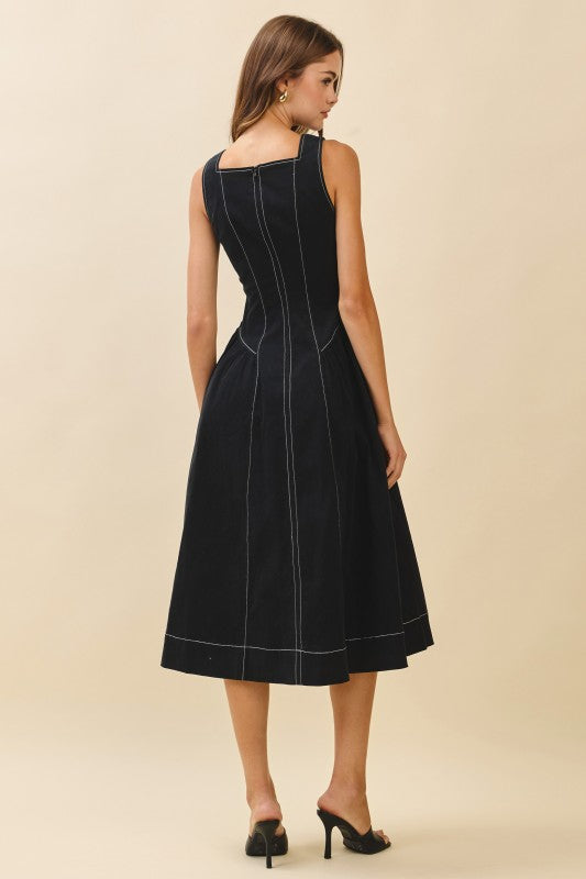The GraphLine Midi is a sleeveless knit dress designed with a modern square neckline and contrasting top-stitch and panel seams for a sleek, structured look. It features a flattering fitted bodice that flows into a flared skirt, complete with practical side pockets and a hidden back zipper closure. Crafted from 97% cotton and 3% spandex, it offers both comfort and a tailored fit.