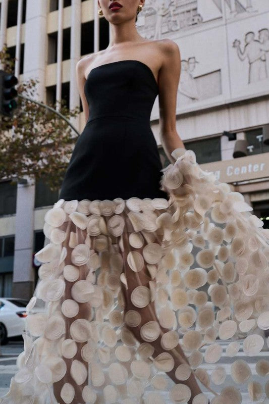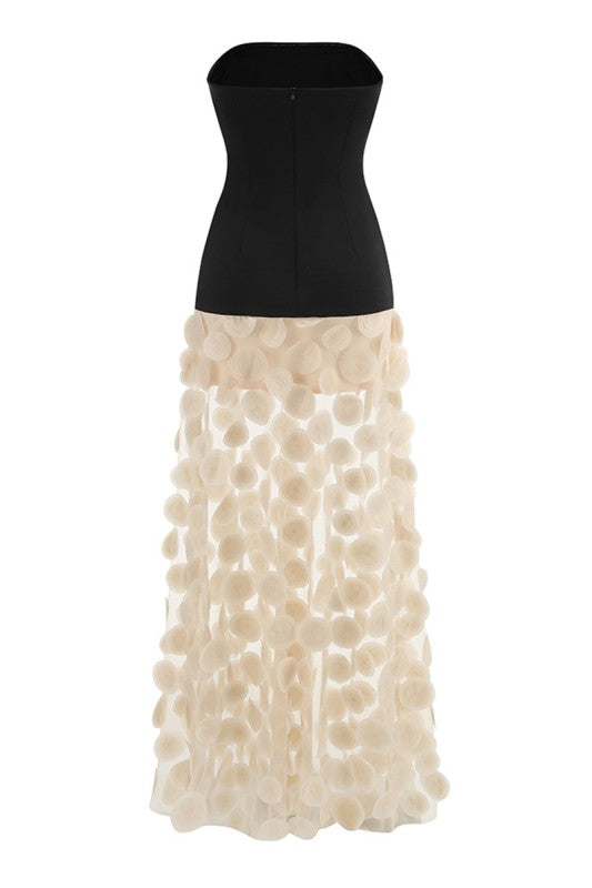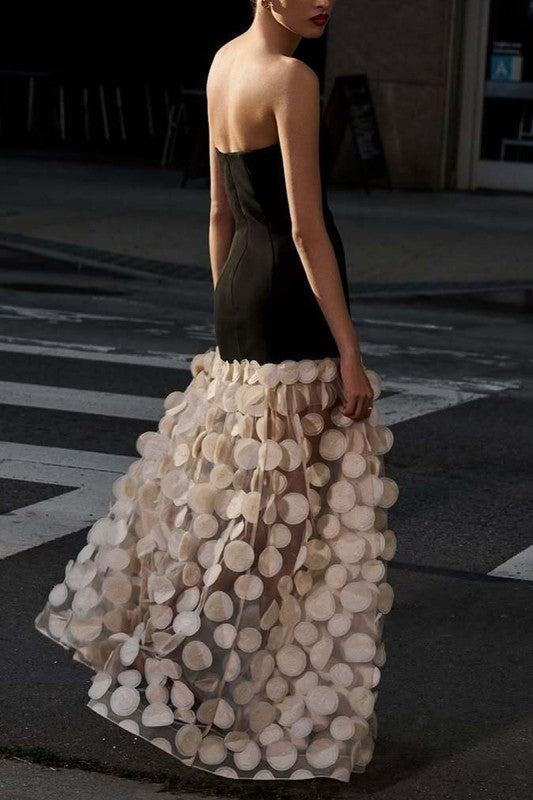 Make an unforgettable entrance in the Luna Cirque Maxi, a strapless evening gown that blends sleek sophistication with whimsical detail. The fitted black bodice contrasts beautifully with the voluminous cream skirt, adorned with dimensional polka-dot appliqué for a modern yet romantic touch. Designed with an invisible back zipper for a smooth finish, this statement gown is crafted from 100% polyester to ensure both structure and flow. Perfect for evening occasions where elegance meets artistry.