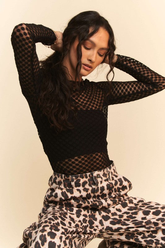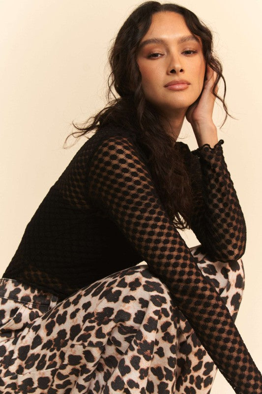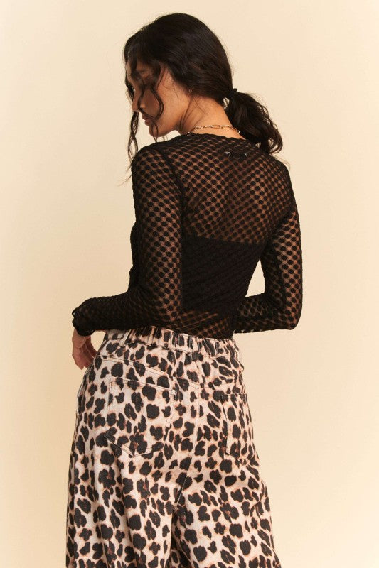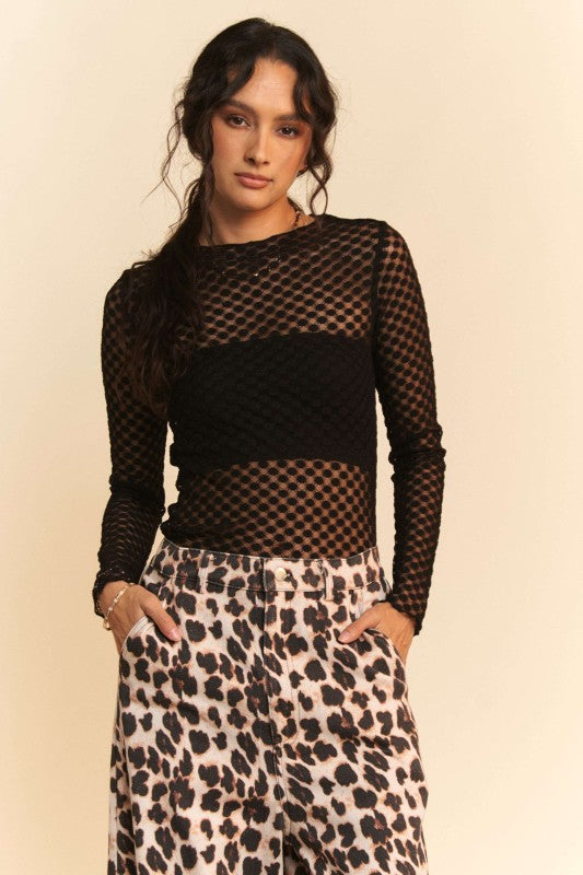 A long-sleeve dot mesh layer with a lightweight stretch fit that’s perfect for styling over your favorite camis and bralettes. Designed with a delicate crispine lace texture and a semi-sheer finish that adds just the right amount of tease to any look. Fabric content: 94% nylon, 6% spandex. 🖤✨