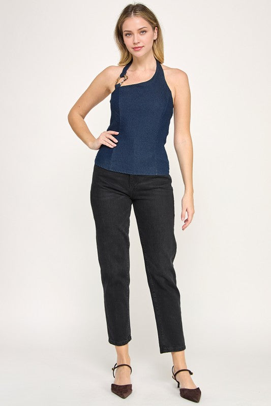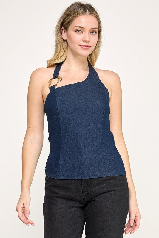 The Metalia Strap Top is a sleeveless halter-neck denim style featuring a sleek asymmetric neckline accentuated with a bold, metallic ring detail. The back smocking panel offers a flexible, flattering fit that contours comfortably to the body. A chic, statement-worthy piece that elevates any look with a modern, polished edge.