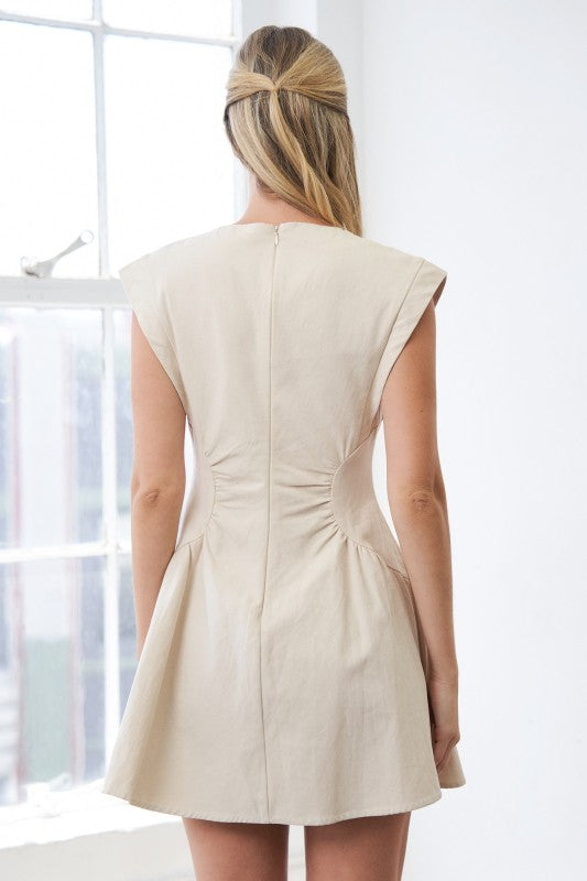 Neutral Form Mini is a structured cotton poplin dress featuring a sleeveless design with extended shoulder detail and gathered side panels that create a flattering silhouette. The fitted bodice flows into a soft A-line skirt, finished with a hidden back zipper for a clean look.