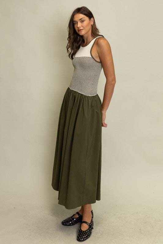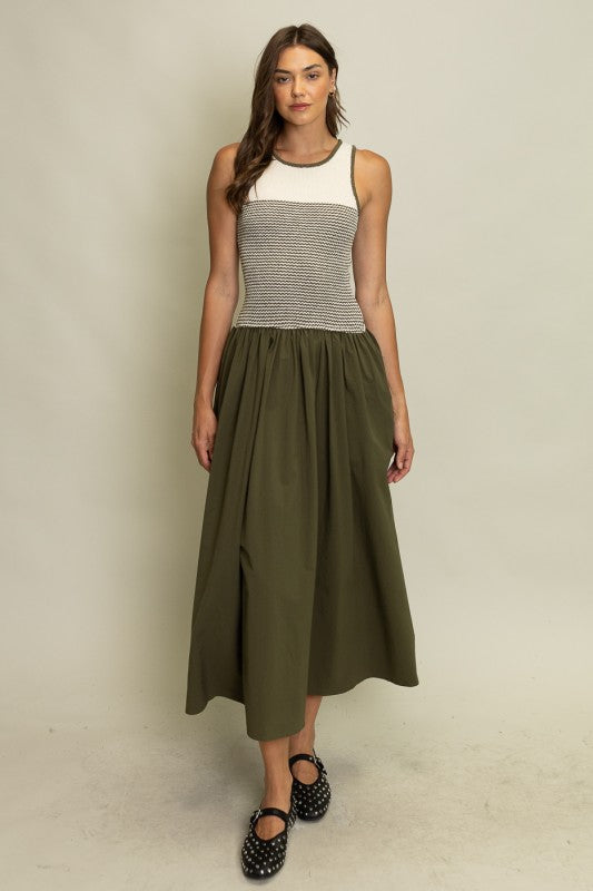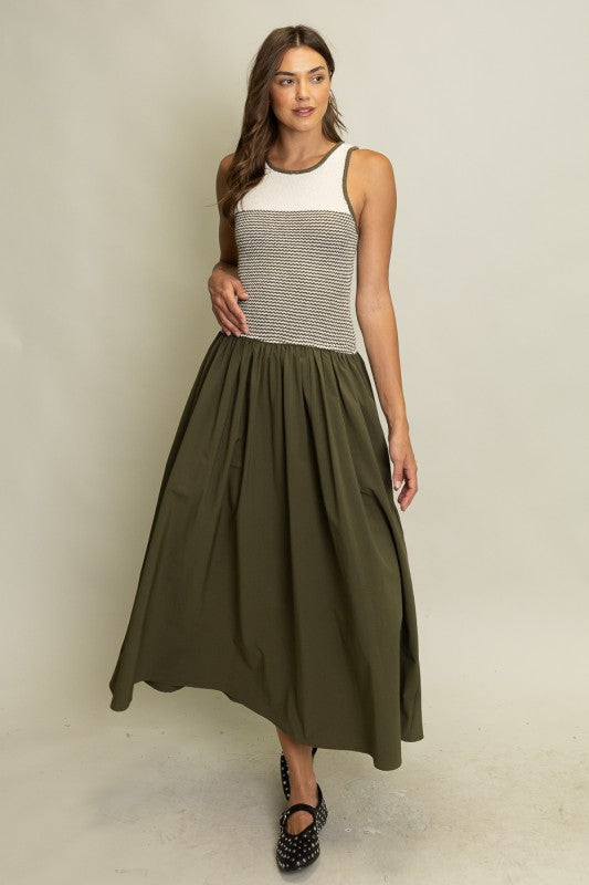 Olive Rhythm Maxi is a two-tone midi dress that pairs a textured, fitted bodice with a flowy olive skirt for an effortlessly elevated look. The sleeveless top features soft structure and contrast, while the relaxed skirt adds movement, dimension, and functional side pockets for everyday ease.