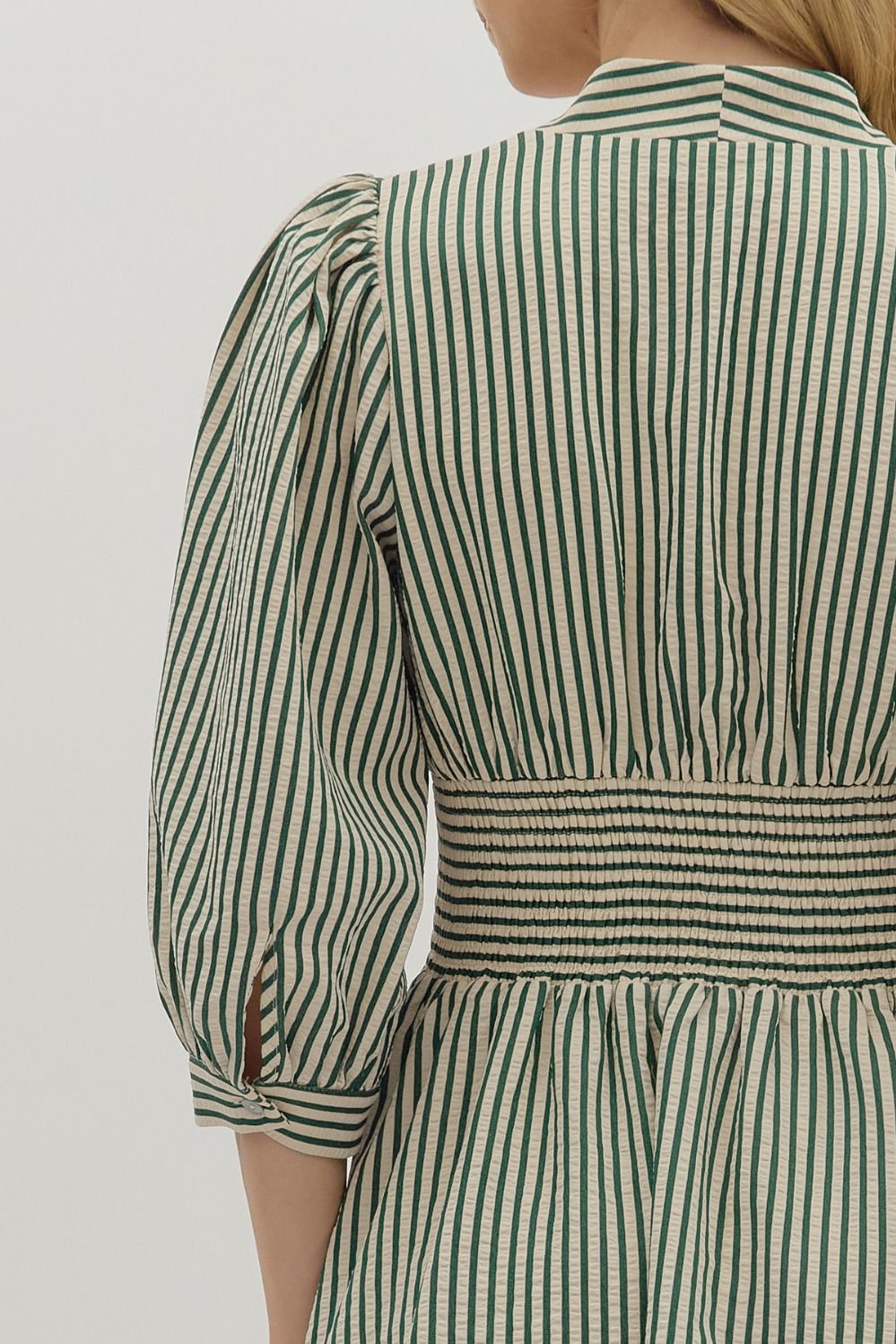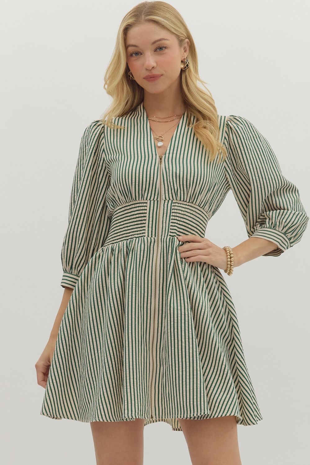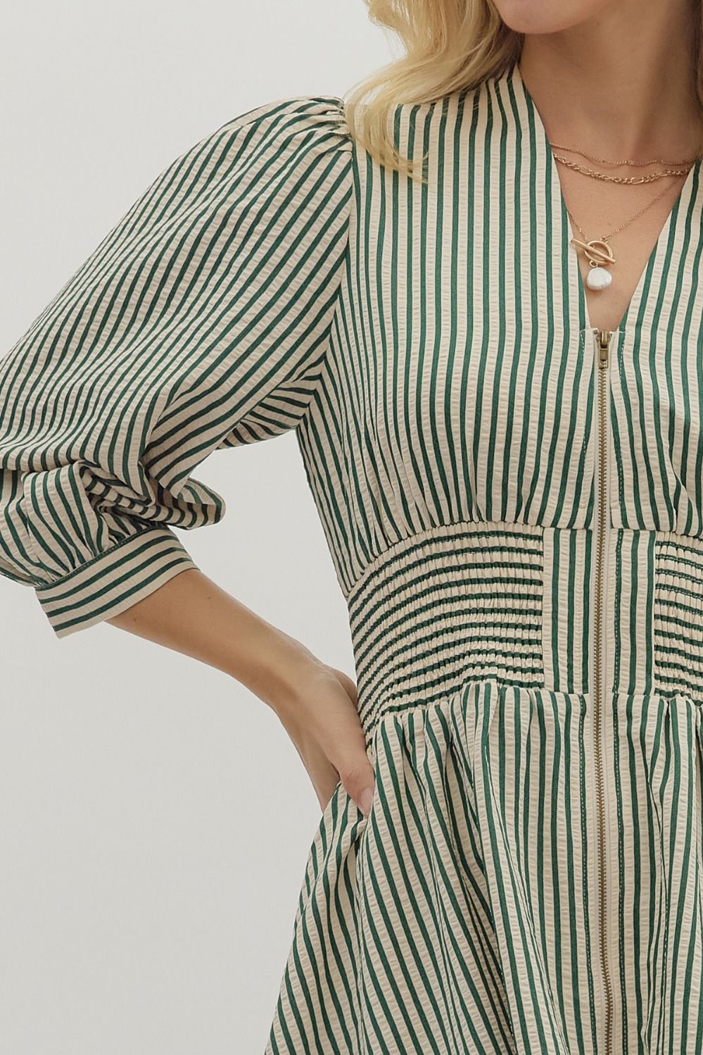 Stripe Canopy Dress is a stripe-patterned mini dress featuring three-quarter length banded puff sleeves and a flattering smocked waistband that enhances the silhouette. Designed with a full zip-front closure and convenient side pockets, this dress blends playful movement with polished structure.
