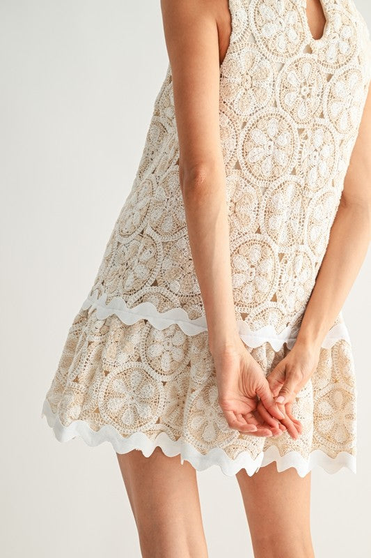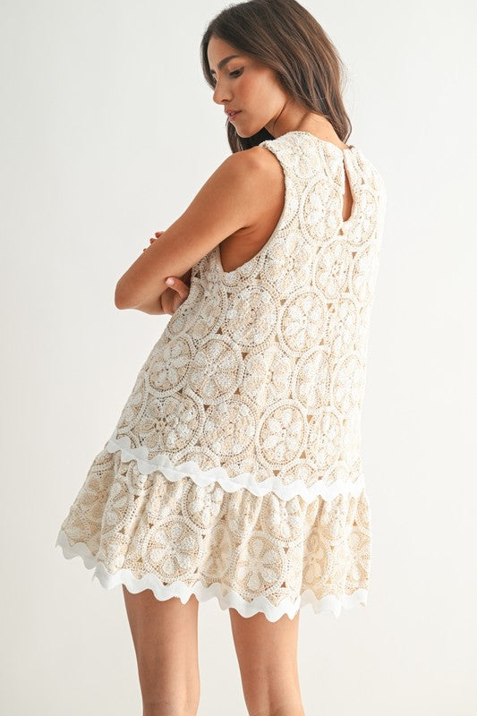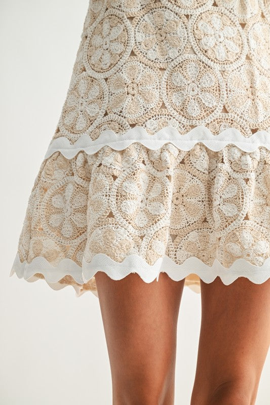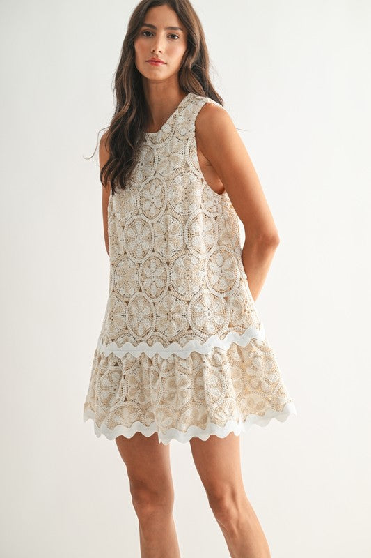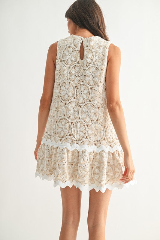 The Sugar Crush Mini is a lace A-line dress that blends playful charm with timeless elegance. Designed in a flattering A-line silhouette, this mini dress features a delicate crochet lace overlay that adds texture and sophistication. Ric-rac trim accents the hemline and tier, giving it a fresh, eye-catching detail. Crafted from 100% polyester with full lining for comfort, this piece effortlessly combines style and ease, making it perfect for special occasions, gatherings, or any standout moment.