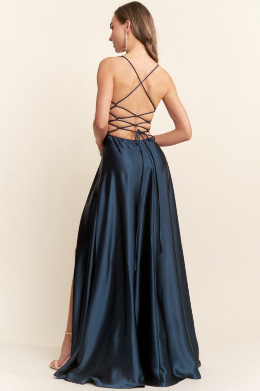 Make an unforgettable entrance in the Teal Eclipse Maxi, a satin A-line gown that perfectly balances elegance with allure. Featuring a scoop neckline and delicate spaghetti straps, this maxi dress flows into a dramatic silhouette with a daring leg slit. The open corset cross-back design adds a striking detail, secured with a fitted zipper waist for a flattering shape. Crafted from a luxe blend of 96% polyester and 4% spandex, it delivers both fluid movement and comfortable stretch.