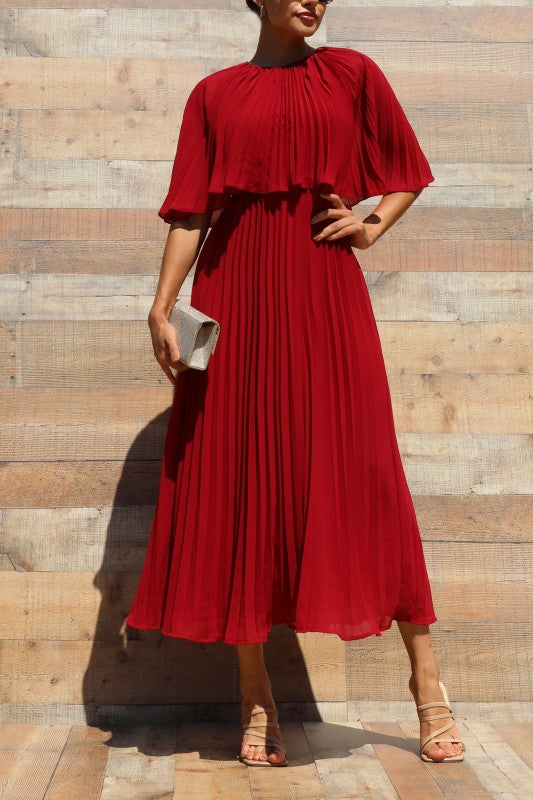 Velour Rouge Dress – An elegant cape-pleated women’s midi dress designed with a graceful flow and timeless charm. Featuring a pleated cape overlay, elastic waistline for a flattering fit, and a sophisticated silhouette that moves beautifully with every step.