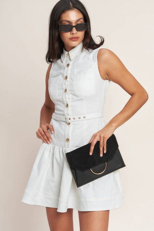 A fresh take on structured femininity. The White Utility Mini features a crisp collared neckline, sleeveless silhouette, and elegant gold front button closure that adds just the right touch of shine. Designed with functional front pockets, a matching self-belt to define the waist, and a flattering drop-waist finish with a soft ruffle hemline for movement and charm.