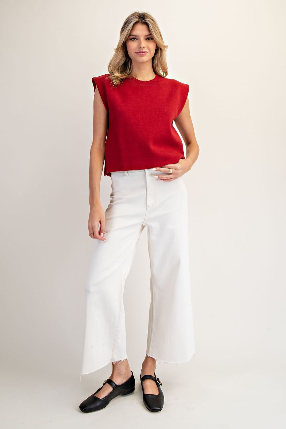 The Wine Frame Knit is a sleeveless knit top featuring a ribbed crew neckline, subtle shoulder structure with extended caps, and a relaxed, slightly boxy silhouette for an effortlessly polished and modern look. Fabric content: 50% viscose, 30% polyester, 20% nylon.