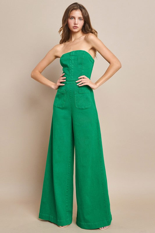 An off-shoulder, strapless bustier-style denim jumpsuit designed to stand out while keeping things effortless. This wide-leg silhouette features a structured bustier look on top with a relaxed, flowy leg for the perfect balance of shape and movement. Made with plenty of stretch, it hugs comfortably without feeling restrictive, making it easy to wear all day (and night). A bold, confident piece that feels modern, flattering, and cool all at once.