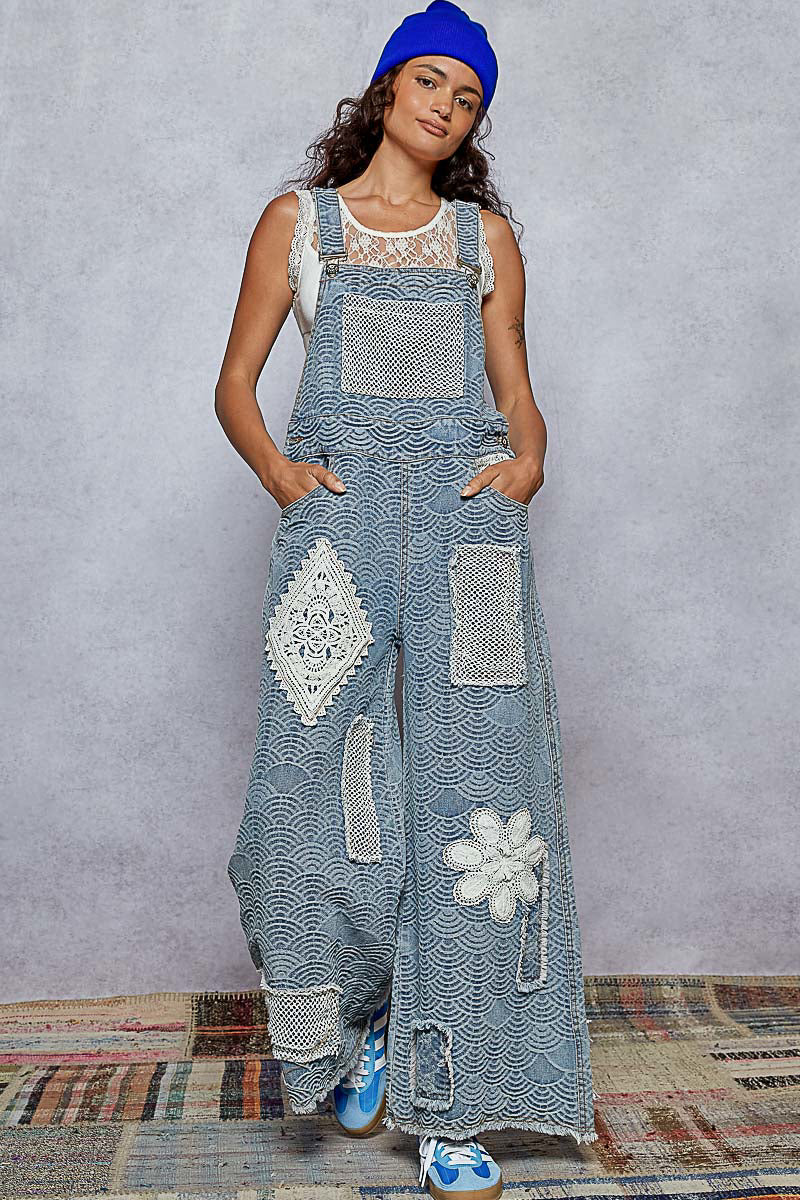Strut into the cool side with the Wave Catwalk Overall — a bold, roomy-fit design made to turn every hallway into your runway. Crafted from imprinted twill with standout variegated crochet patches and mesh-overlay pockets, it blends edgy attitude with boho charm. Adjustable straps let you customize your vibe, while every patch tells its own story of playful, effortless cool. Fabric content: 100% cotton.