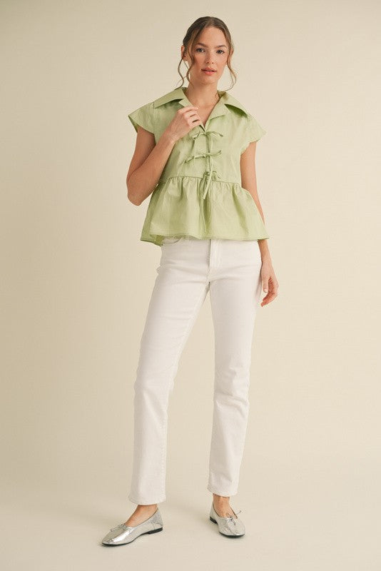 LimeLeaf Bow Top is a cotton poplin peplum blouse featuring a notched collar neckline, playful front bow ties, and capped sleeves for a soft, feminine touch. The cinched waist creates a flattering silhouette, while the breezy structure adds a fresh, effortless feel to any look.