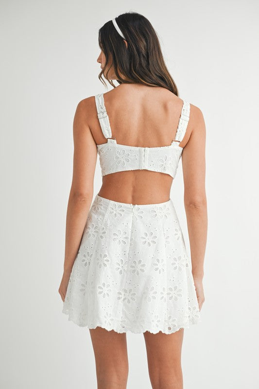 Palmari Dress is a breezy and romantic eyelet mini featuring adjustable straps, flirty side and back cutouts, and a flattering A-line silhouette. Designed with a hook-and-eye closure and an invisible back zipper for a seamless fit.