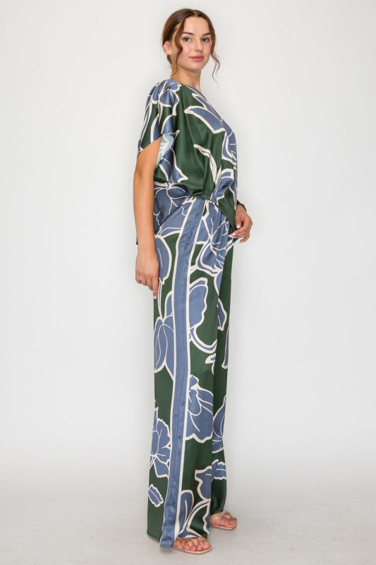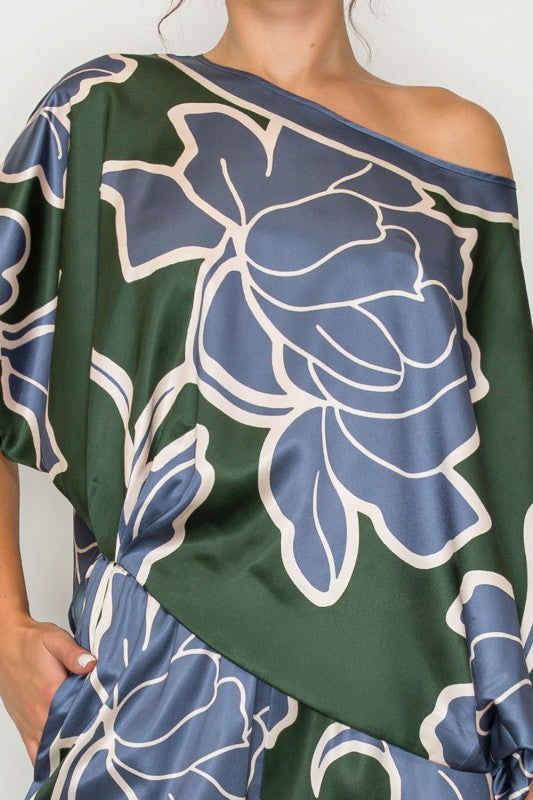 The Botanic Skyline Set showcases a striking harmony of bold florals and contemporary elegance. The top features a cropped silhouette with a statement neckline and three-quarter sleeves, designed to style effortlessly on or off the shoulder. A thoughtfully placed asymmetrical shirring detail at the side waist enhances the drape, creating a refined and flattering flow.