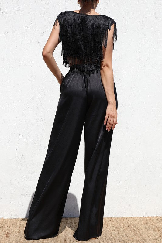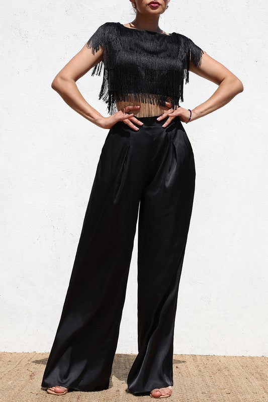 The Fringe & Flow Set brings elevated movement and modern glamour to any event. This two-piece ensemble features a striking crop-length top adorned with cascading fringe that sways beautifully with every step. Designed for comfort and ease, the top offers a simple pull-on fit without zippers.