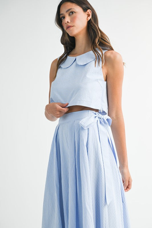 A classic gingham moment with a sassy twist. This baby-blue set features a pleated Peter Pan collar sleeveless crop top paired with a matching pleated midi skirt with a chic side self-tie detail. Clean, flattering lines thanks to side invisible zippers on both the top and skirt, keeping the look polished and effortless. Sweet, structured, and just bold enough to turn heads—perfect for brunch, summer plans, and everything in between.