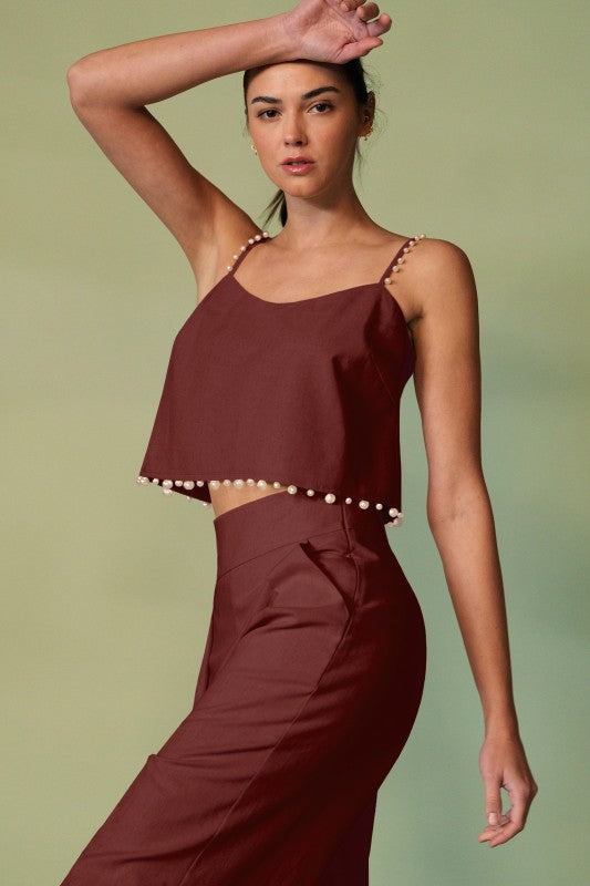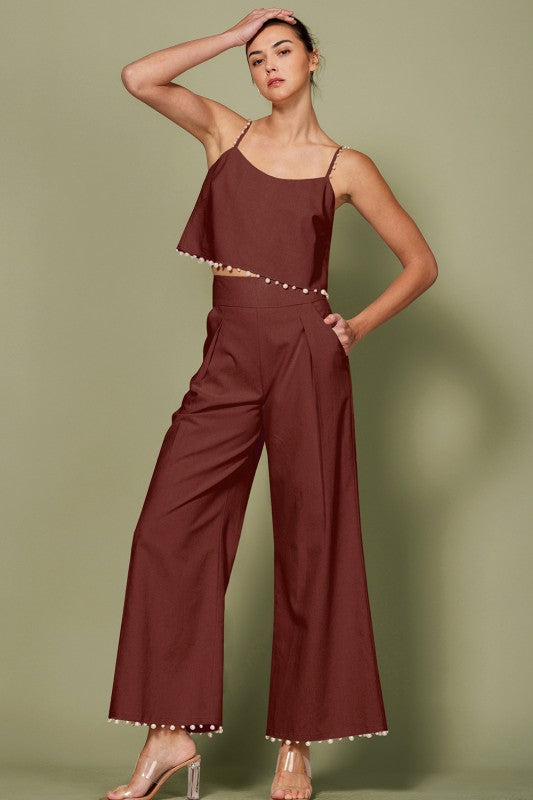 This is a chic two-piece pants set featuring a pearl-trimmed camisole top with adjustable straps. The matching pearl-trim wide-leg pants include a side invisible zipper and functional side pockets for comfort and ease.