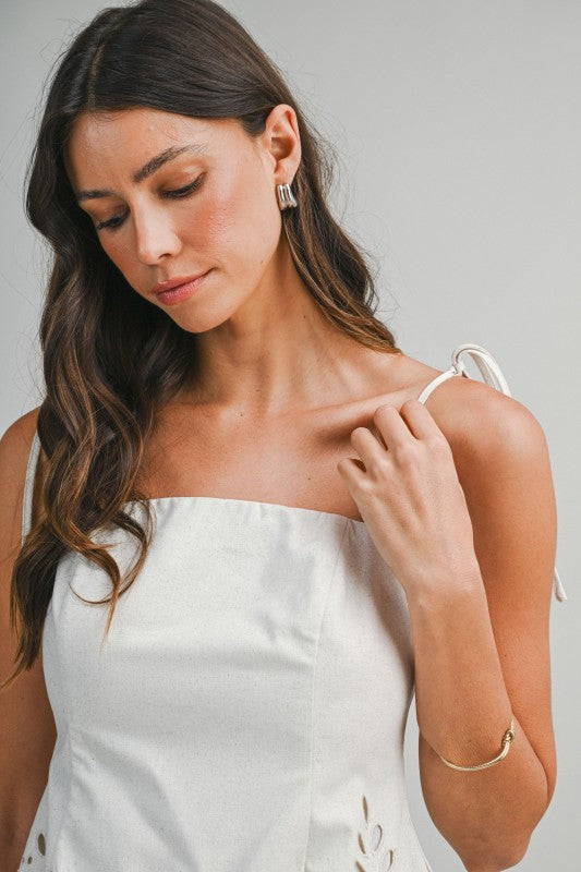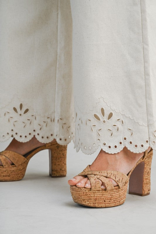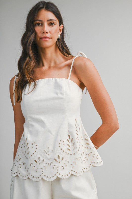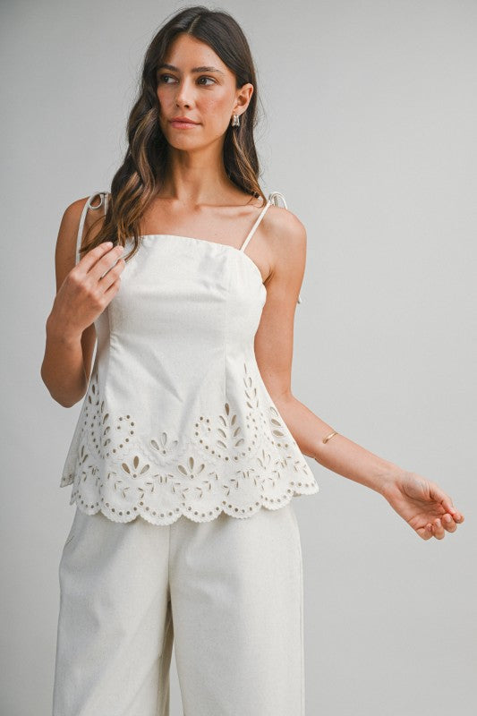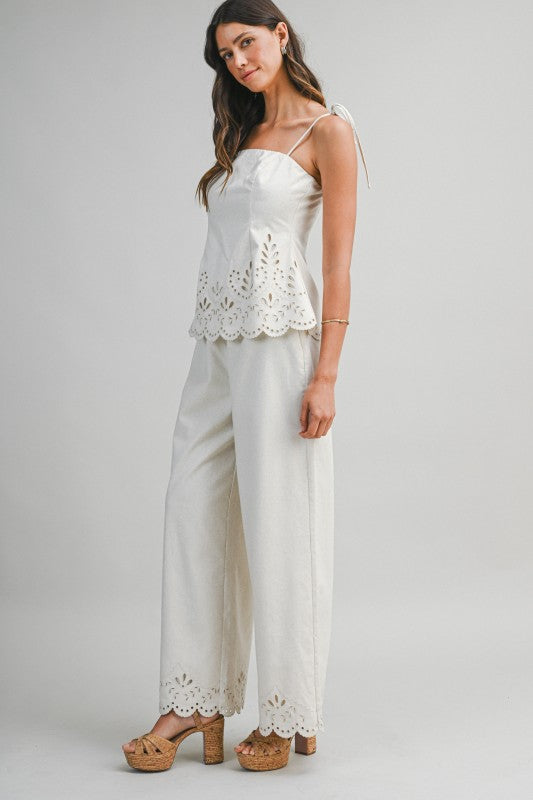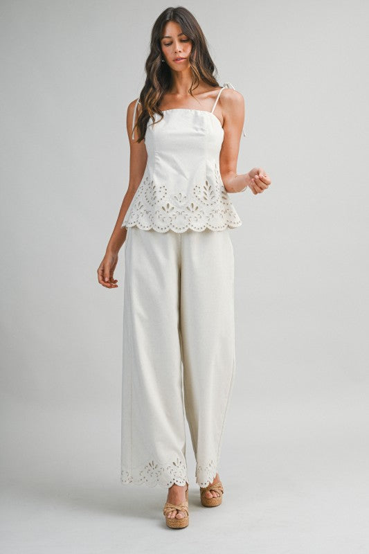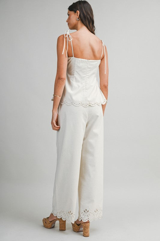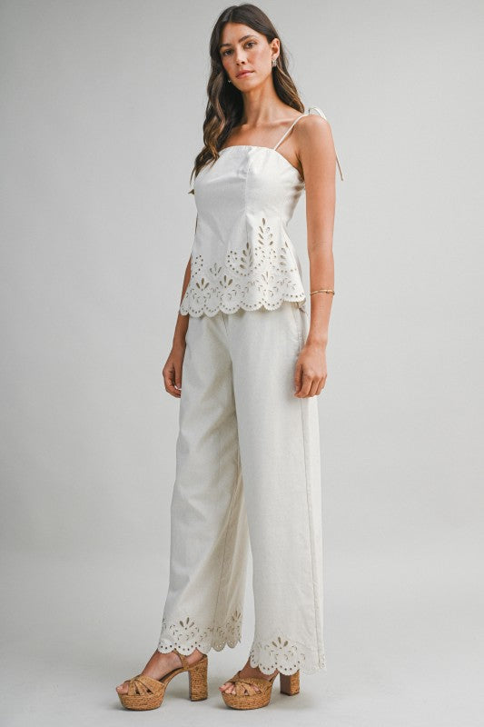 Sandwave Cutout Set is a two-piece ensemble featuring a tie-strap cami top paired with matching wide-leg pants. Designed with intricate cutout embroidery along the scalloped hemline, this set brings an elevated, artisanal feel with effortless movement. The cami top is finished with a back zipper closure for a clean, structured fit, while the pants feature a discreet side zipper for easy wear. Crafted in a breathable linen-blend fabric that feels light and refined.