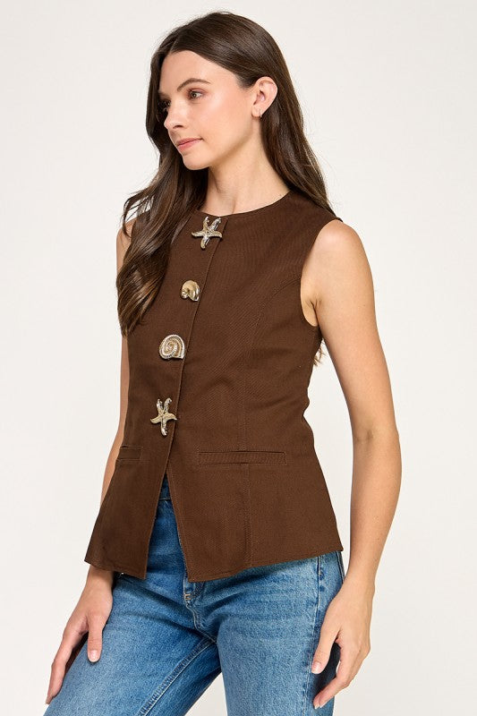 The Choco Shell Vest blends refined tailoring with coastal-inspired charm. This dark brown vest features unique gold statement buttons shaped like starfish and seashells, adding an elegant yet distinctive touch. Designed with a structured silhouette and crafted from a soft blend of 97% polyester and 3% spandex, it offers both comfort and subtle stretch. Whether styled with denim or tailored pants, this vest brings a chic, seaside twist to any look.