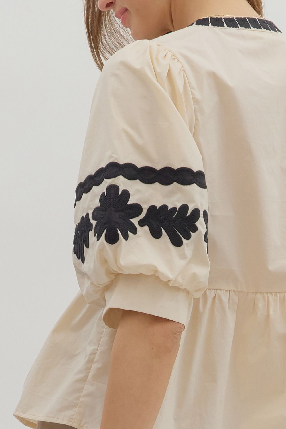The Coralie Top is a solid, three-quarter bubble sleeve blouse featuring a ruffled hem and beautifully detailed floral embroidery along the sleeves and neckline. Designed with a relaxed yet feminine silhouette, it brings charm and personality to any look.