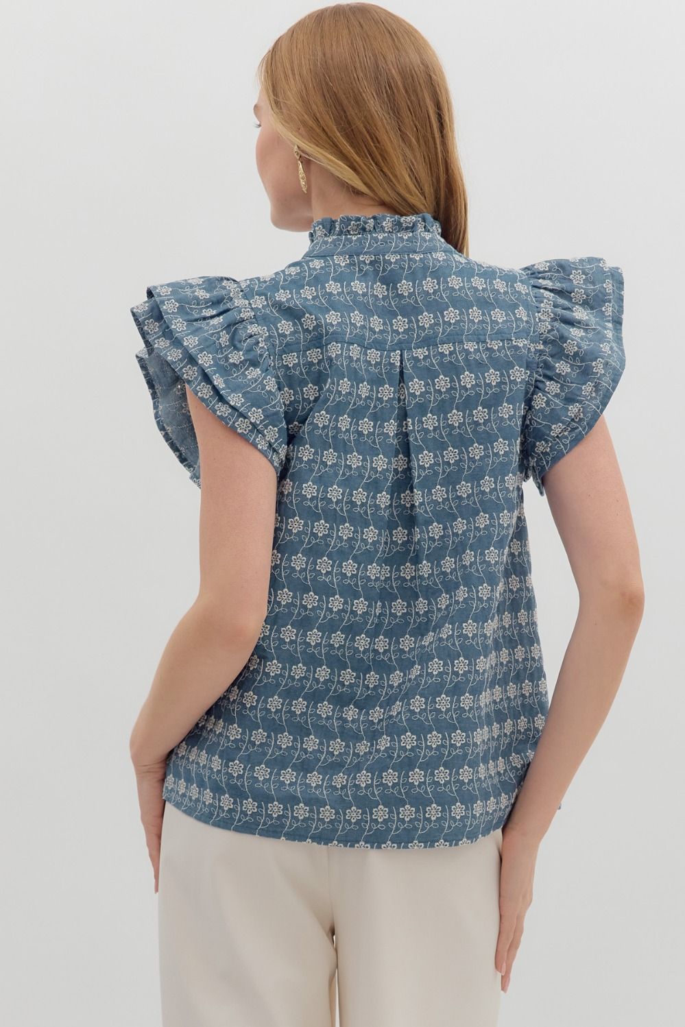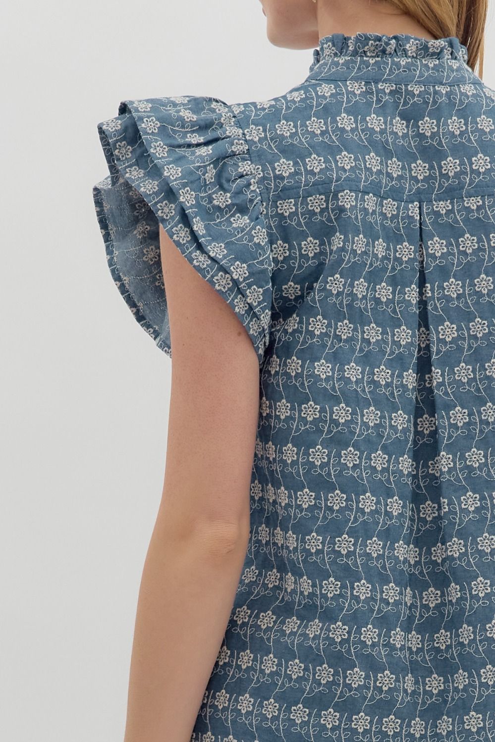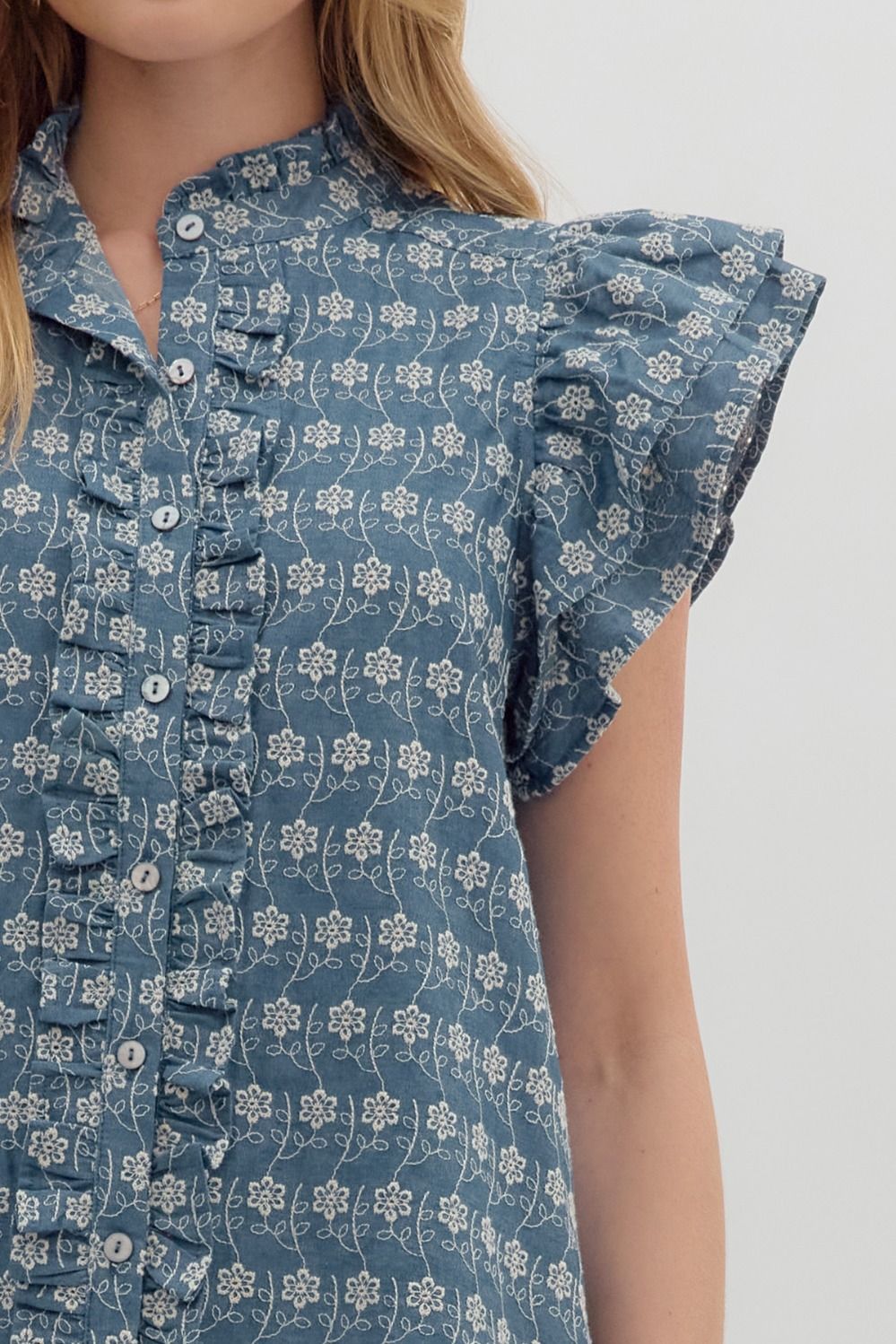Add a touch of vintage charm to your wardrobe with the Denim Rufflefield Top. This floral embroidered beauty features tiered flutter sleeves and delicate ruffle accents along the band collar and button-down front. The soft denim-like fabric blends comfort with effortless style, making it perfect for any casual-chic day.