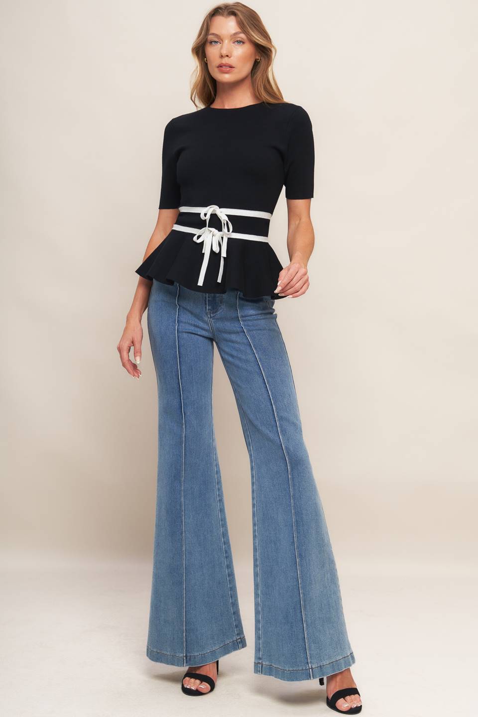 Double Knot Peplum is a solid sweater knit top featuring a classic round neckline, short sleeves, and a statement bow detail at the front. The flattering peplum hem adds a feminine silhouette, while the back zipper closure ensures a sleek finish. Crafted from a soft blend of 72% viscose and 28% polyester, it’s a polished yet versatile piece for any wardrobe.
