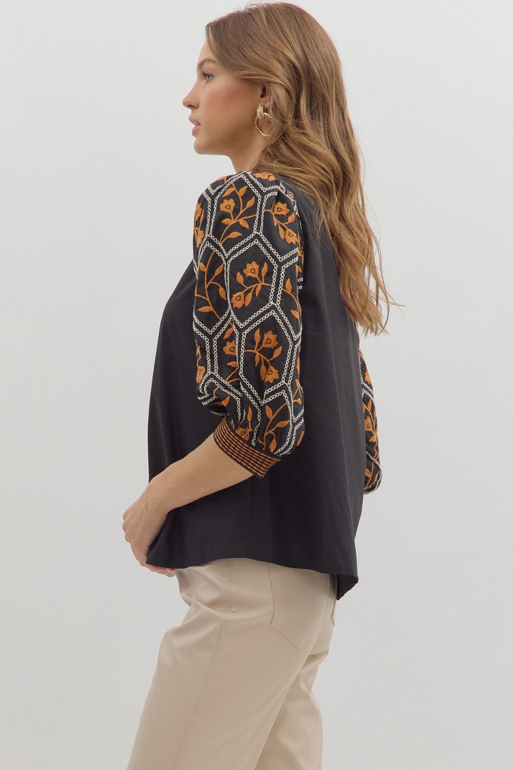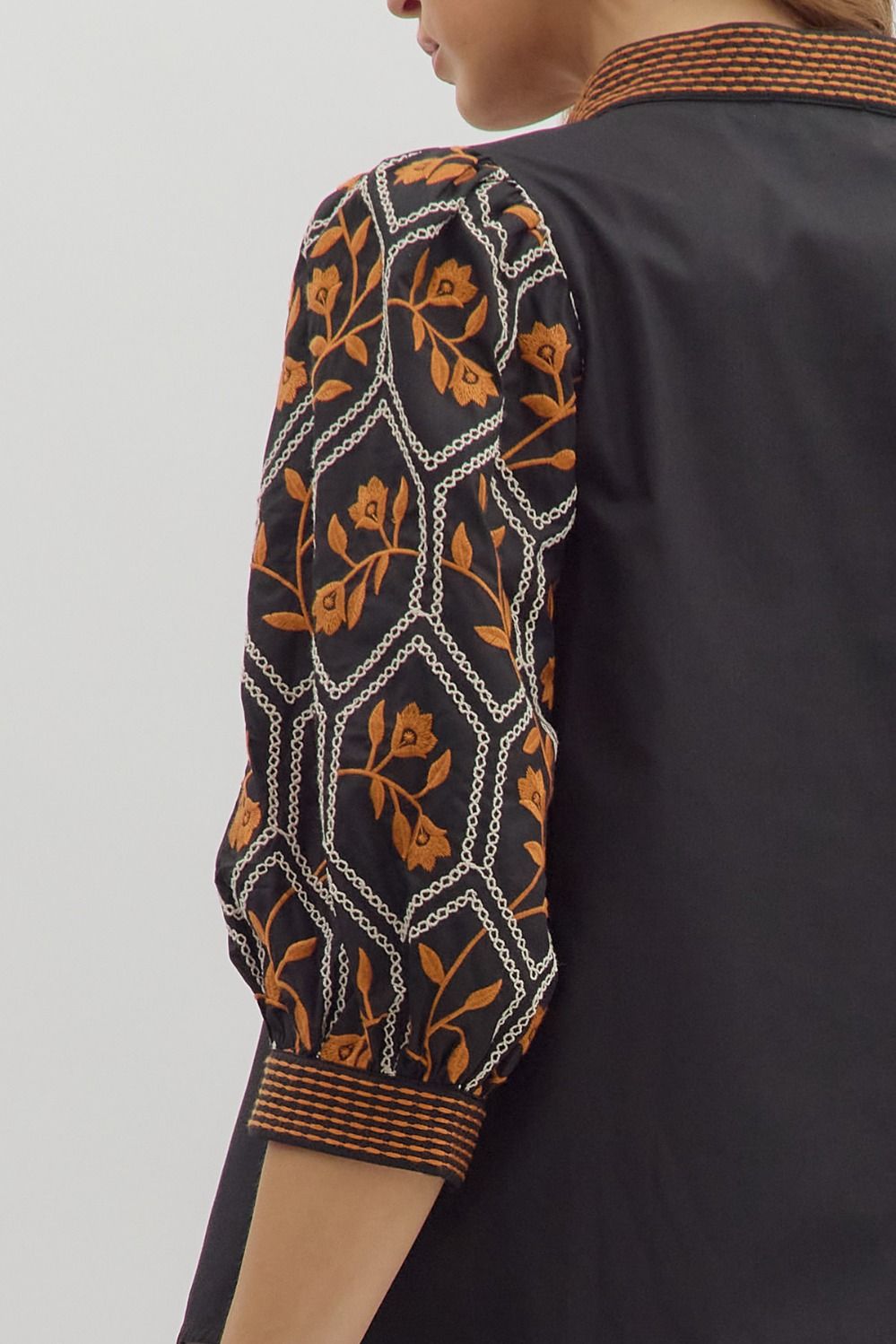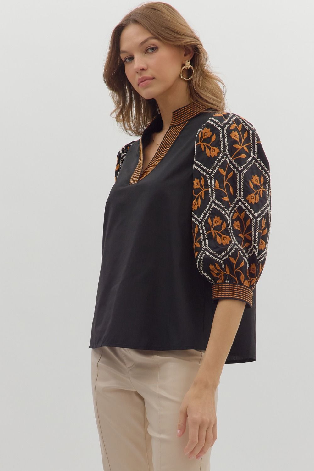 The Emberloom Top is a floral-pattern embroidered top with three-quarter sleeves, designed with an embroidered stitch–embellished band along the neckline and cuffs. Crafted from a blend of 80% polyester and 20% cotton, it offers a structured yet comfortable fit that blends artisanal detail with modern elegance.